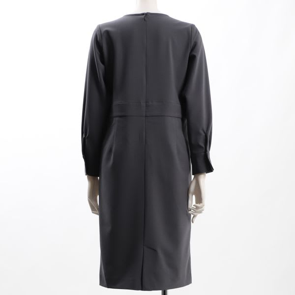 ウエストの切り替えラインがアクセントのオープンフロントネックワンピース。小物には、バーモチーフイヤリングとポインテッドトゥパンプスを合わせてスタイリッシュな雰囲気に、パールネックレスとラウンドトゥパンプスで女性らしくまとめてもいいですね。