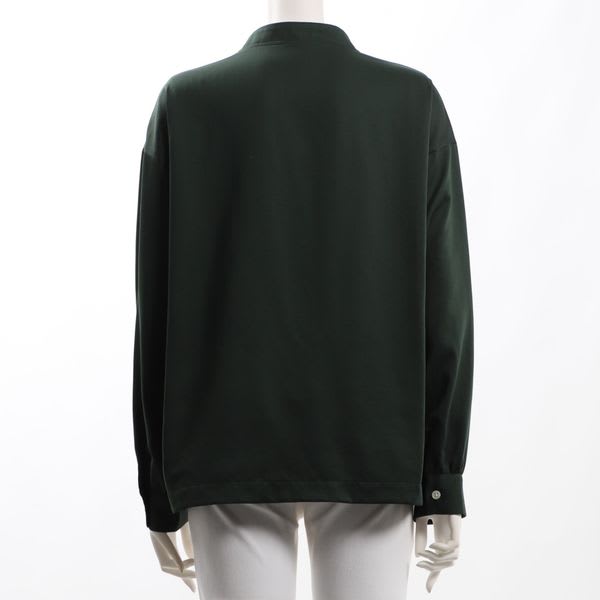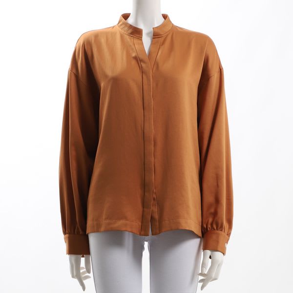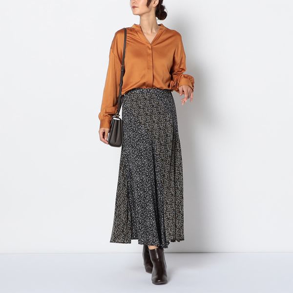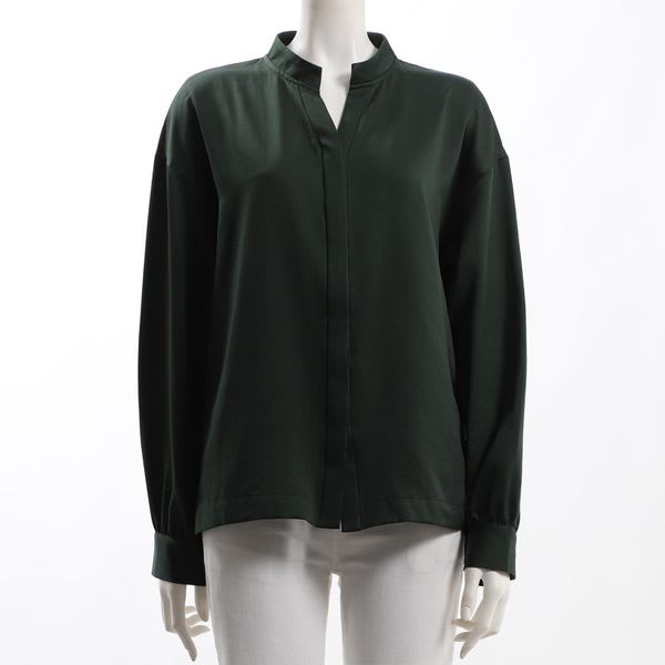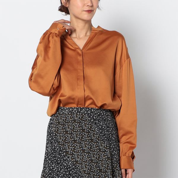 オープンフロントネックのブラウスです。タイトスカートとラウンドトゥパンプスを合わせて女性らしい着こなしや、センタープレスパンツとビットローファーを合わせたマニッシュな着こなしも素敵ですよ。