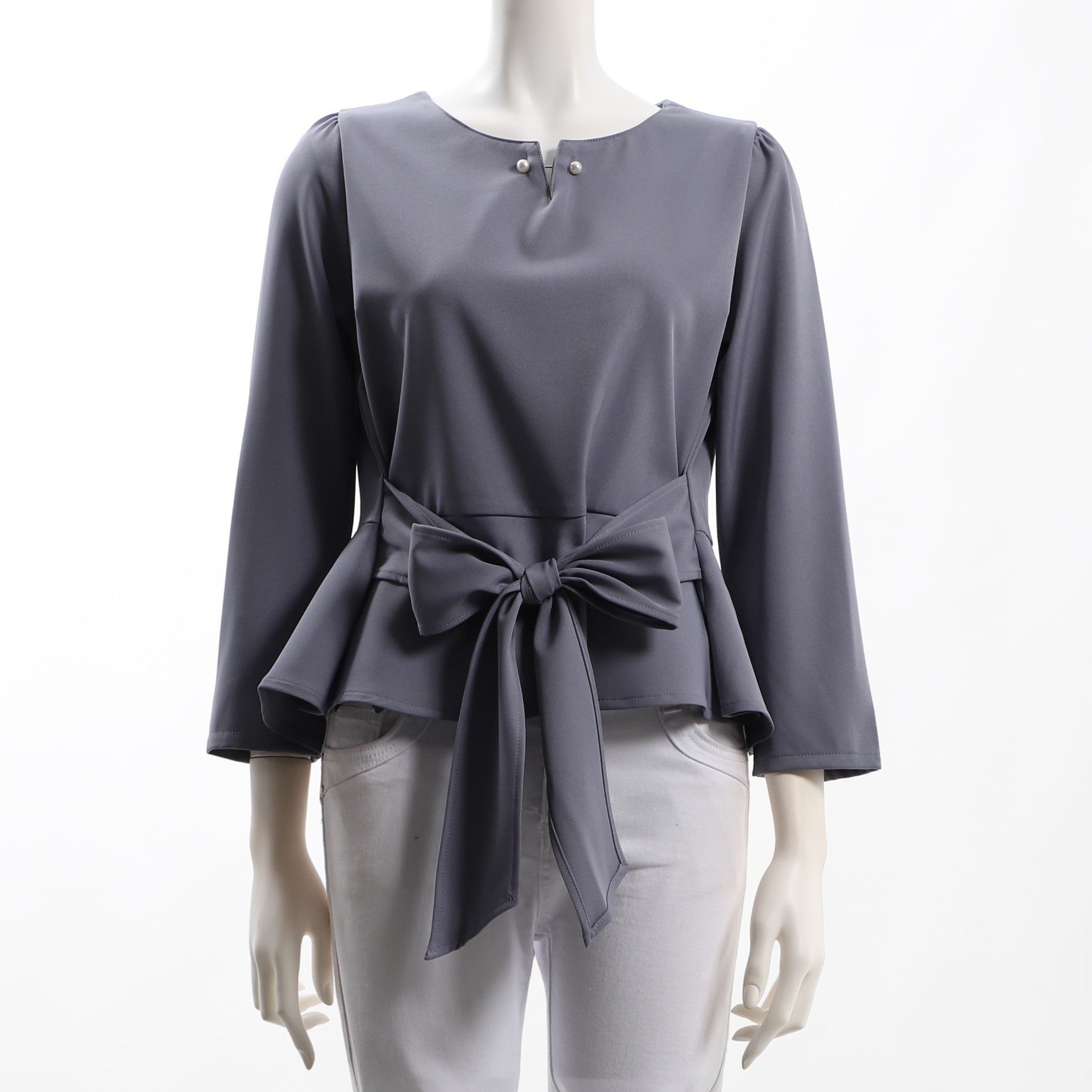 ネックラインのパールとウエストリボンがポイントのべプラムブラウス。ボトムスにはテーパードパンツを合わせて甘辛MIXスタイルに、タイトスカートで女性らしくまとめてもいいですね。