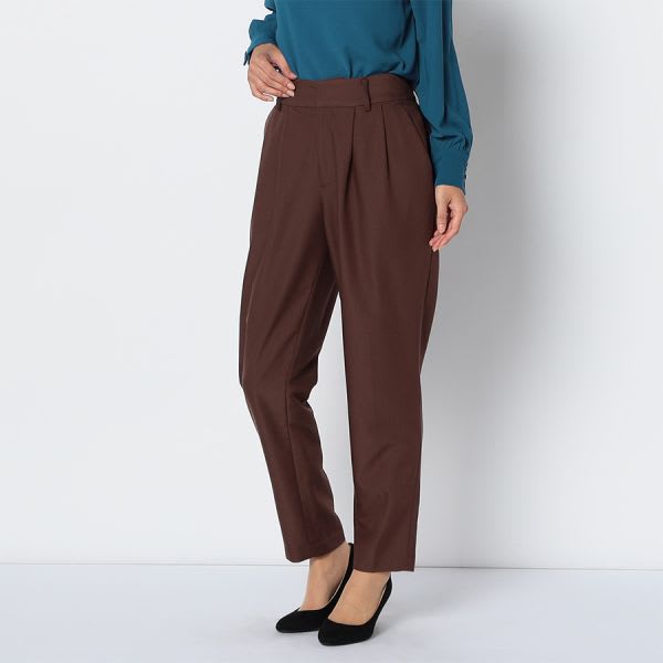バックウエストゴムのタック入りテーパードパンツ。ケーブルニットを合わせてカジュアルな着こなしに、バンドカラーシャツを合わせてきれいめに着てもいいですね。