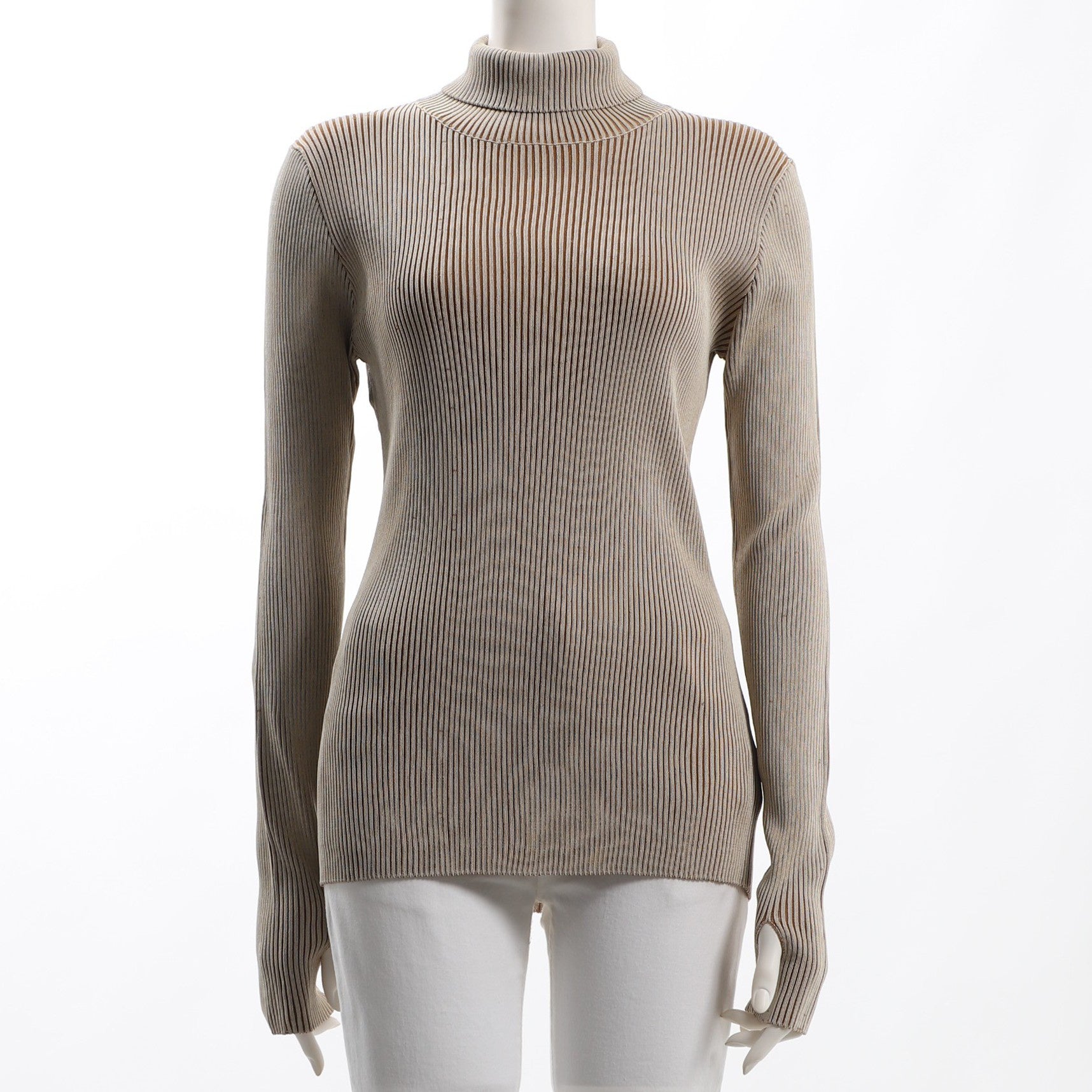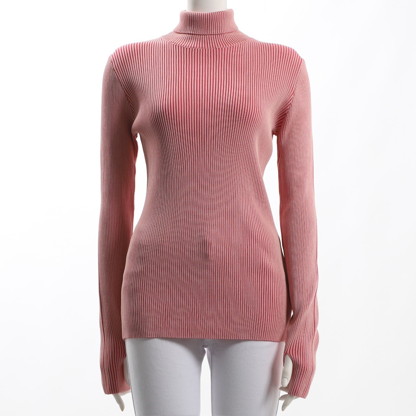 フィンガーホールがポイントのリブニット。リブは濃淡の付いた配色にしているので奥行きがあり、ネックラインにかけてコントラストが高まるメリハリのあるシルエットに。ボトムスにはプリーツスカートを合わせて女性らしく、ワイドパンツでカジュアルに仕上げても良いですね。(襟元は折らずに立ててもお使いいただけます)