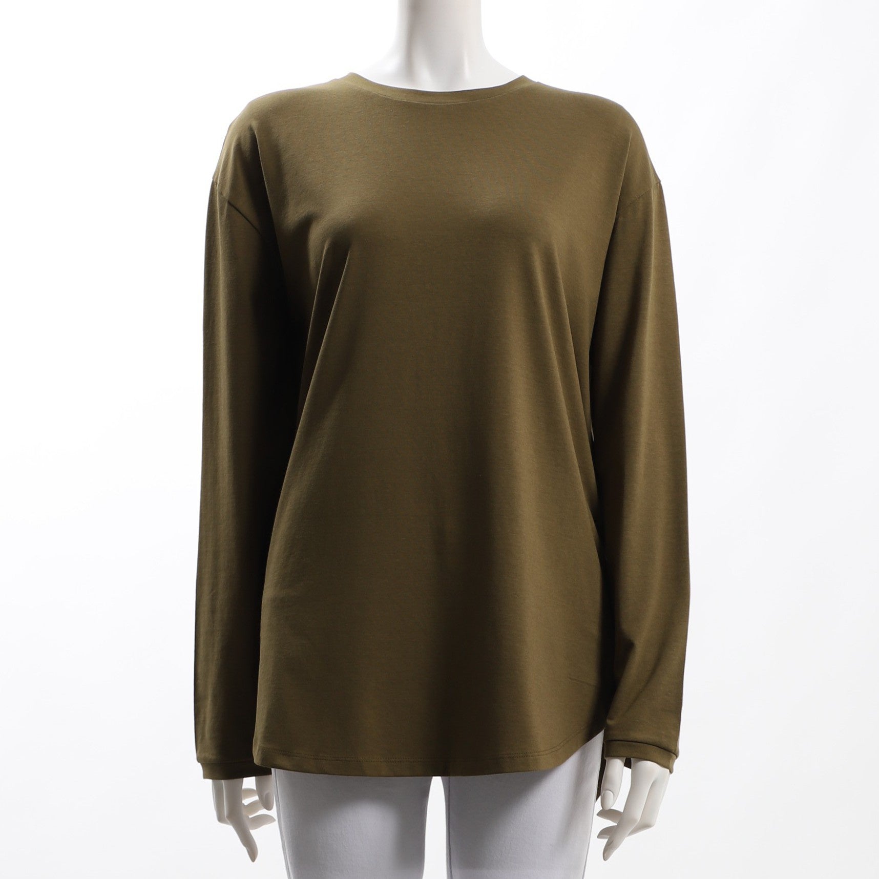 後ろのアシメボタンデザインが特徴的なモダールカットソーです。デニムパンツとスニーカーを合わせてカジュアルコーディネートに、テーパードパンツとパンプスを合わせて綺麗めコーディネートもいいですね。