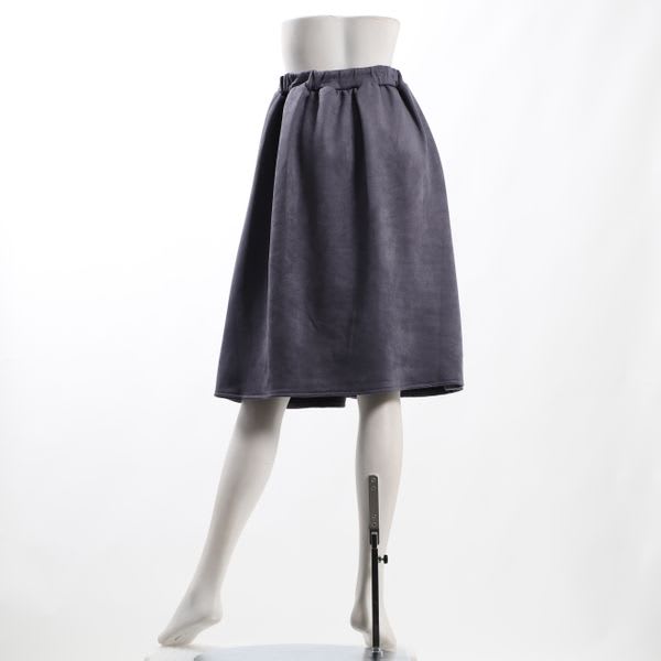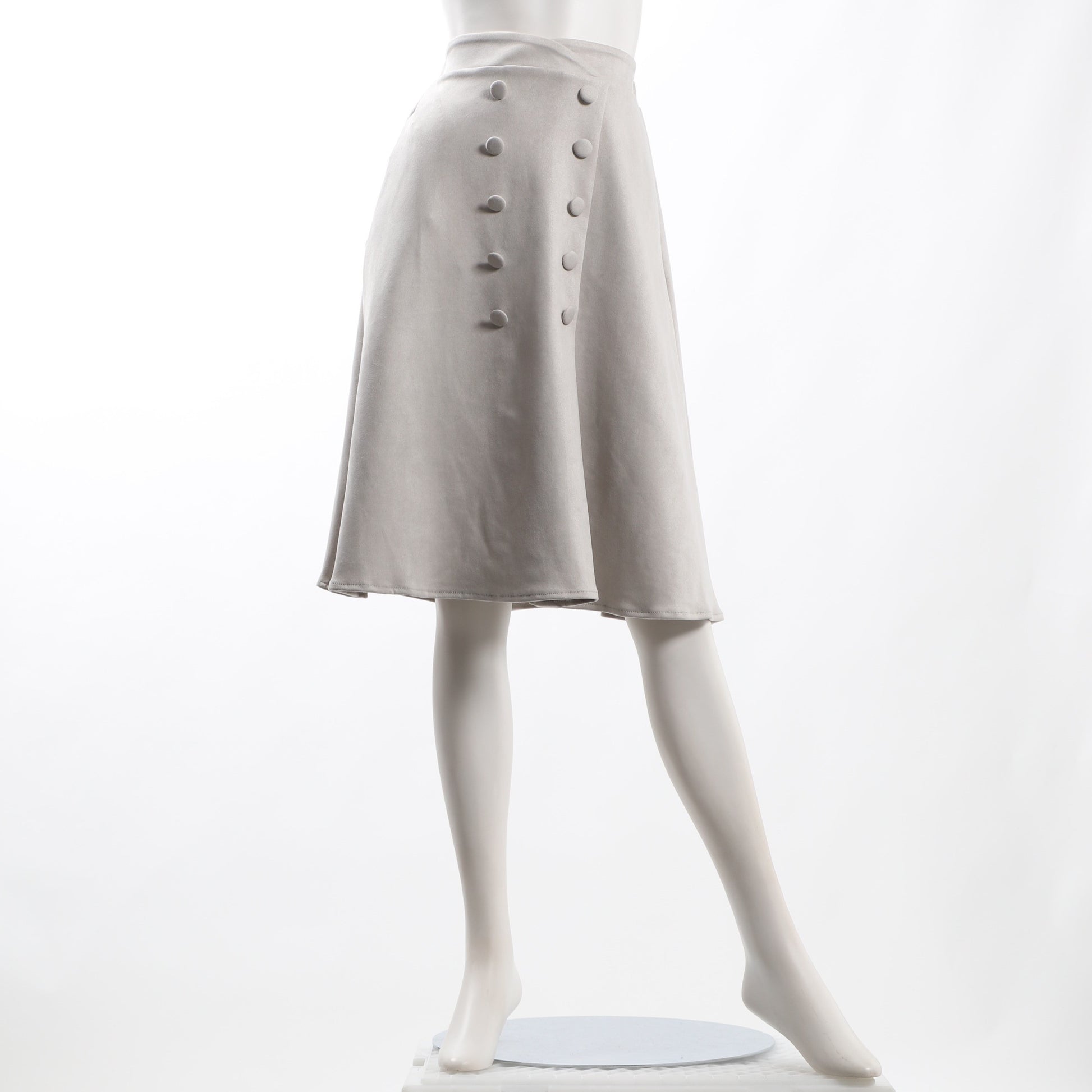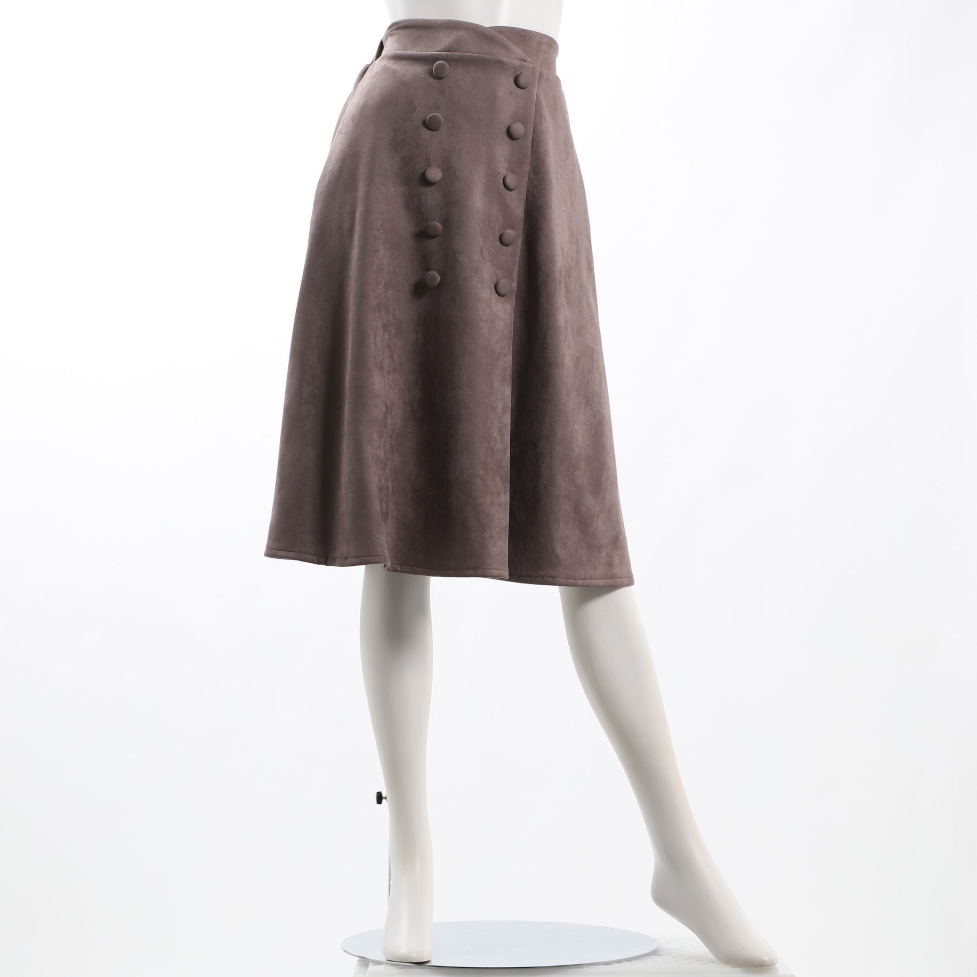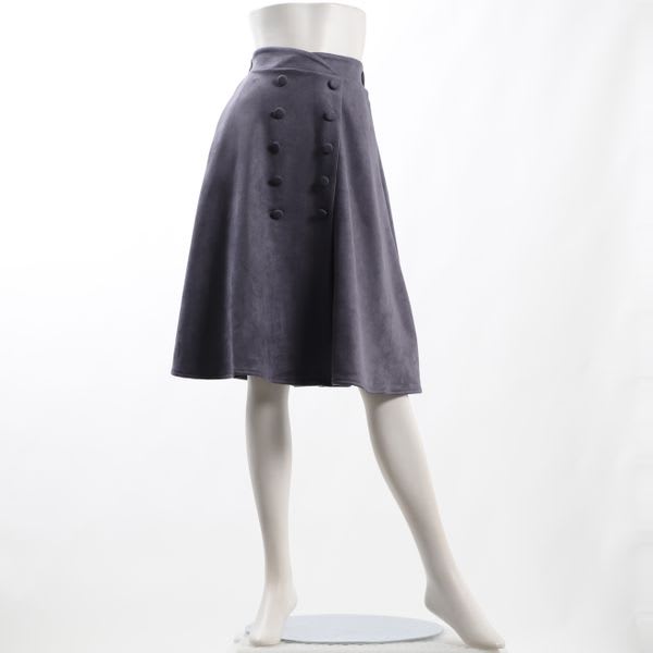 フェイクスウェードのダブルボタンフレアスカートです。トップスにはギャザーネックブラウスを合わせてフェミニンに、ハイゲージニットでキレイめカジュアルにまとめてもいいですね。