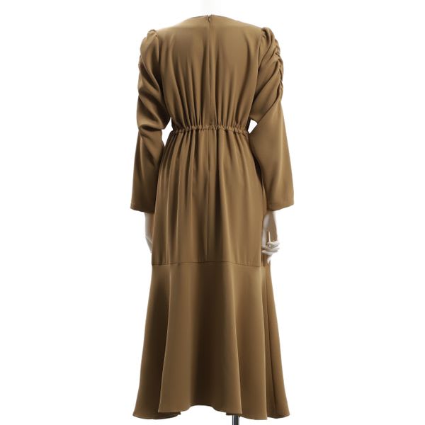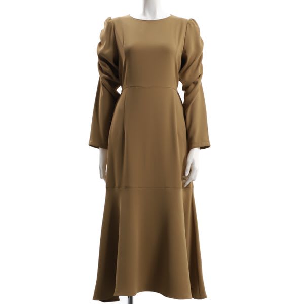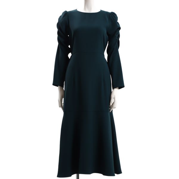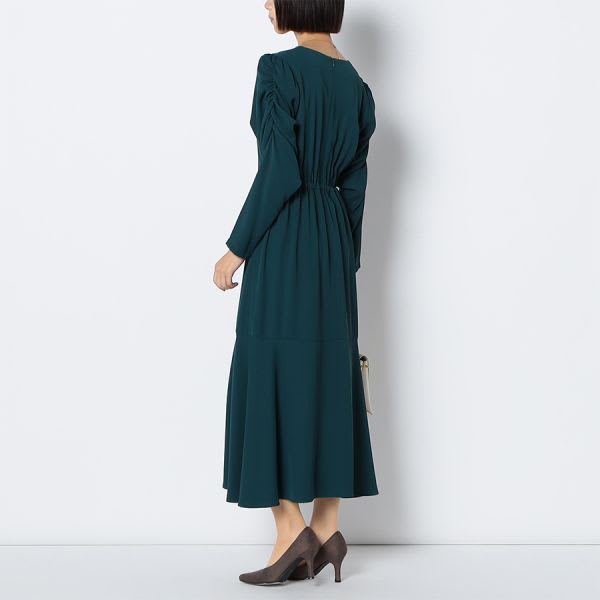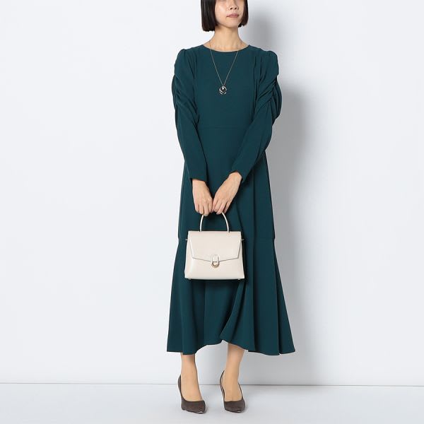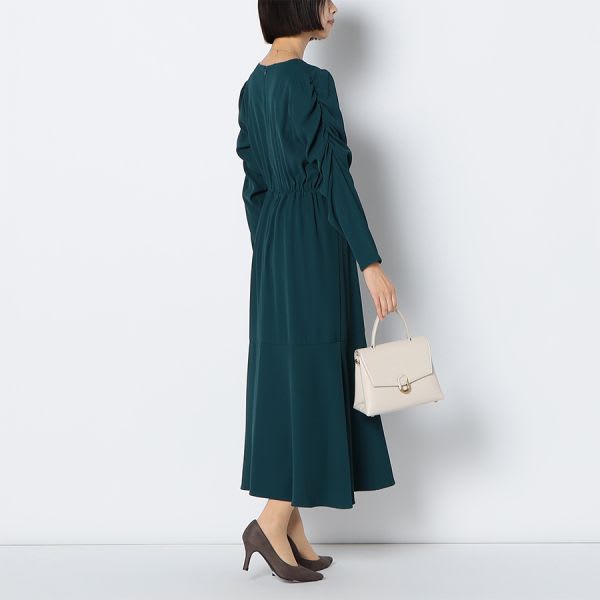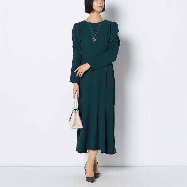 パワショルデザインのマーメイド切り替えワンピース。ゴールド系のロングネックレスを合わせてエレガントに、パールのネックレスを合わせて華やかに仕上げるのも素敵です。