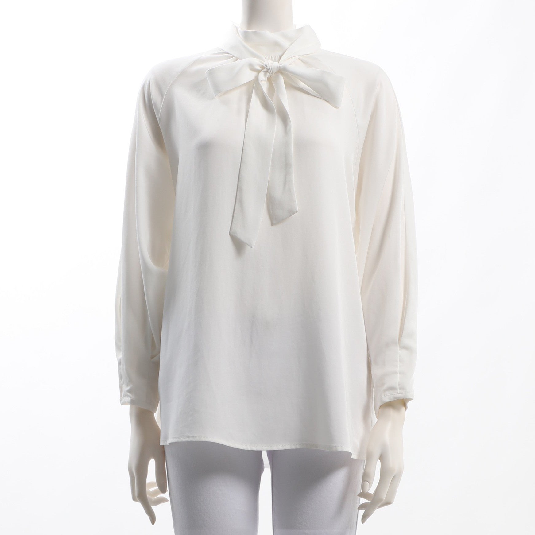 ボウタイネックのラグランスリーブブラウスです。デニムパンツとスニーカーを合わせてカジュアルに、プリーツスカートとバレエシューズを合わせてフェミニンに着こなしても素敵ですよ。