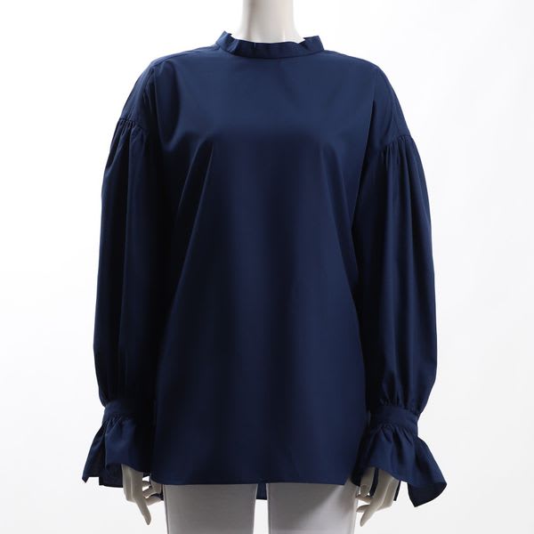 スタンドカラーのボリュームスリーブブラウスです。テーパードパンツとポインテッドトゥパンプスを合わせてキレイめスタイルに、デニムとスニーカーでカジュアルな着こなしも素敵ですよ。
