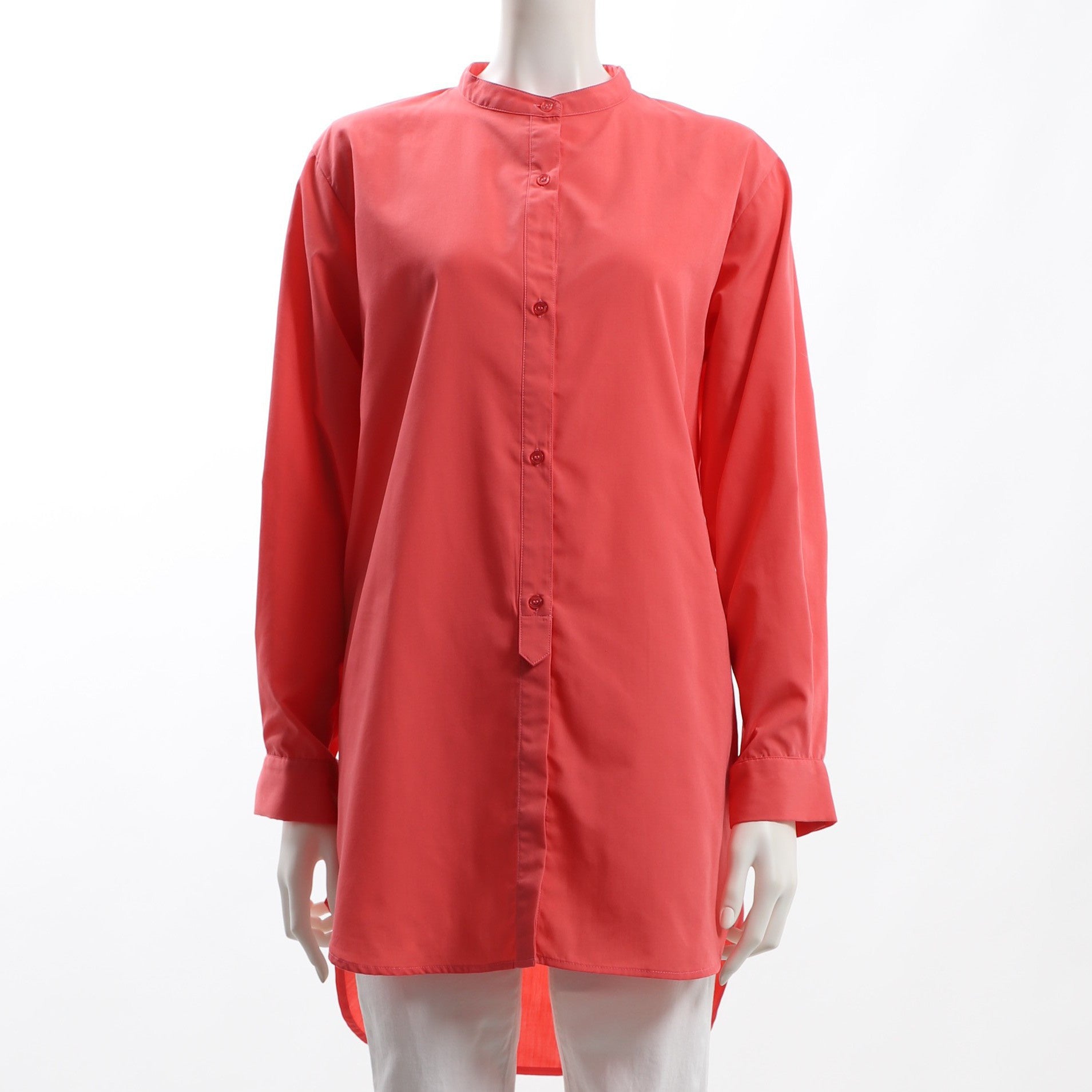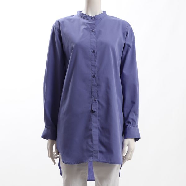シンプルなスタンドカラーシャツブラウスです。フロントのボタンを外し、羽織として着用することもできます。デニムパンツとスニーカーを合わせてカジュアルスタイルに、ストレートパンツとローファーを合わせてマニッシュスタイルもいいですね。