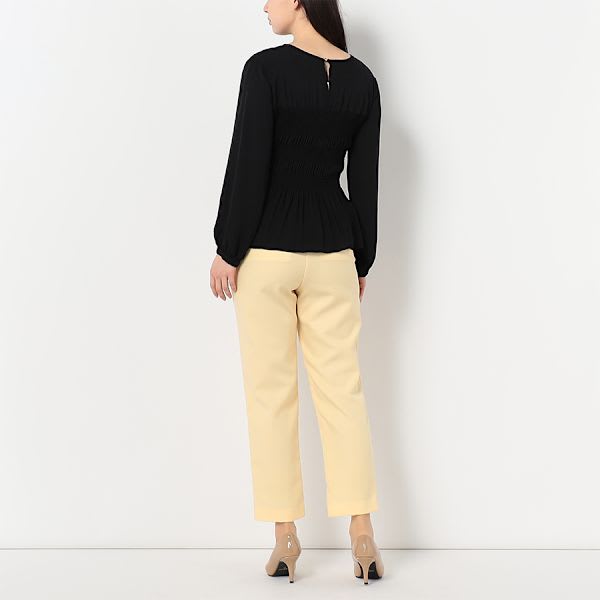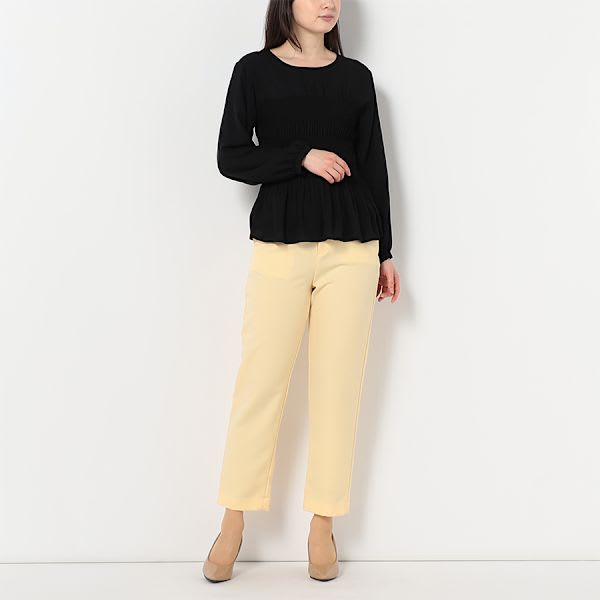 ボウタイブラウスにポインテッドトゥパンプスを合わせて、キレイめに。カットソーにスニーカーを合わせて、カジュアルに仕上げても◎です。