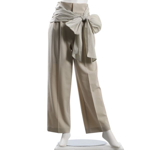 タイプライターリボンツータックパンツ。さらっと落ち感のあるウォッシャブル可能なT/Wツイル素材に、ハリのあるタイプライター素材の軽いリボンを脇にあしらった、モードで女性らしい印象を与えるコンビパンツです。幅広のリボンは脇から縫い付けているので着崩れの心配がなく、フロントでウエストマークをするようにリボン結びや、ひと巻きしてラフに垂らしたり、前でクロスしてから後ろで結んでポイントをつけたアレンジも可能です。