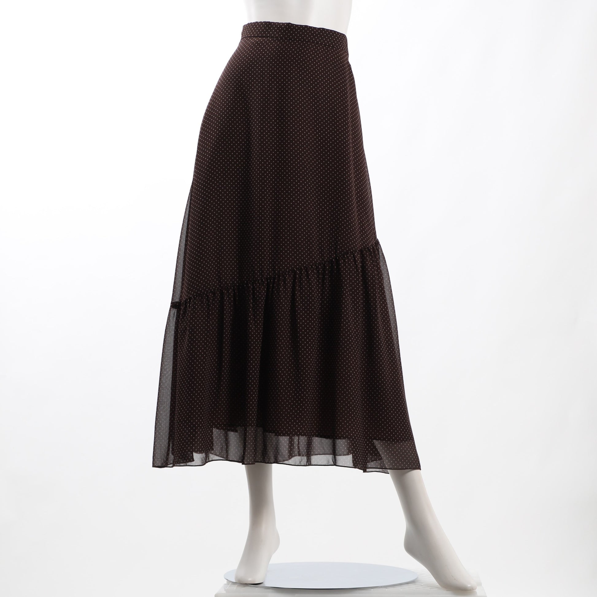 裾のデザインがポイントのドット柄スカート。トップスにはギャザーネックのとろみブラウスを合わせてフェミニンに、クルーネックカットソーでカジュアルダウンしてもいいですね。