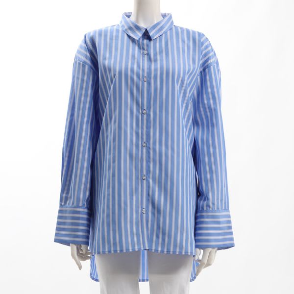 ストライプ柄のシャツです。デニムパンツとスニーカーを合わせてカジュアルに、タイトスカートとパンプスでフェミニンな着こなしもいいですね。