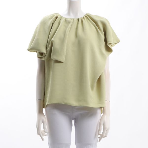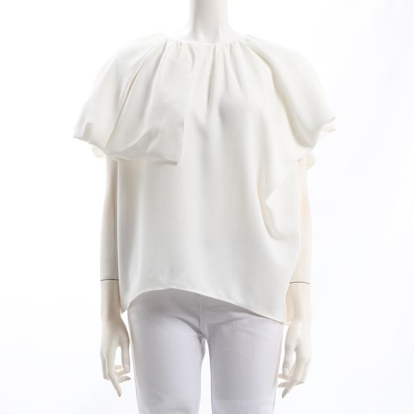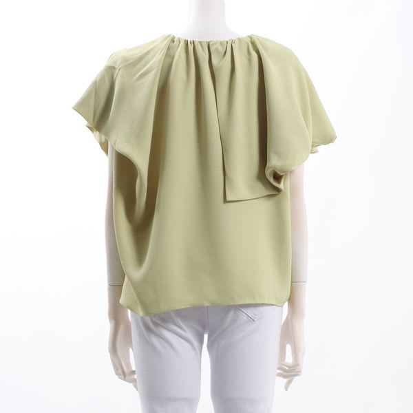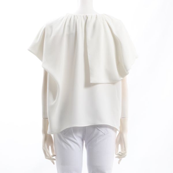 アシンメトリーのラッフルデザインがポイントになったブラウス。ボトムスにはテーパードパンツを合わせてスッキリと、ベルト付きのタイトスカートでメリハリを利かせてもいいですね。