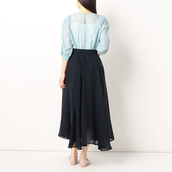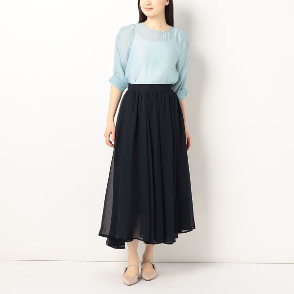 ふんわりとしたお袖がポイントのシアーブラウス。インナーには、透けても良いカラーのキャミソールを着てくださいね。ボトムスにはフレアスカートを合わせて甘めな着こなしに、デニムパンツでラフにまとめても素敵です。