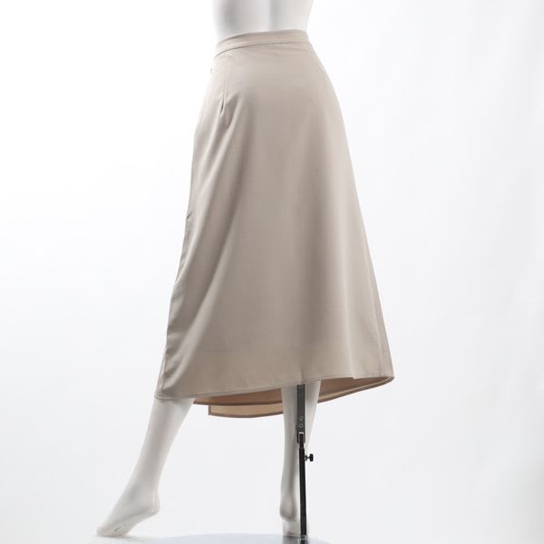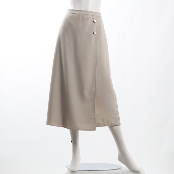 フロントのボタンがポイントのラップ風スカートです。スタンドカラーブラウスとラウンドパンプスを合わせて女性らしいスタイルに、リブカットソーとスニーカーを合わせてカジュアルスタイルも素敵ですよ。