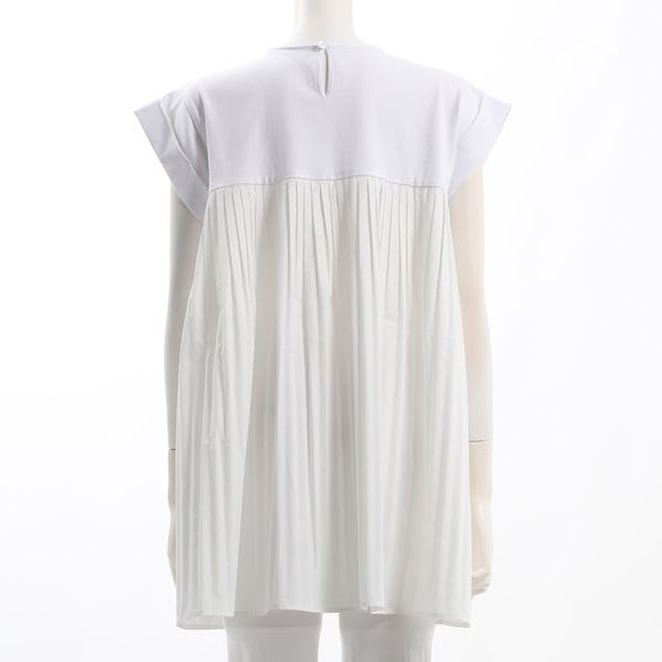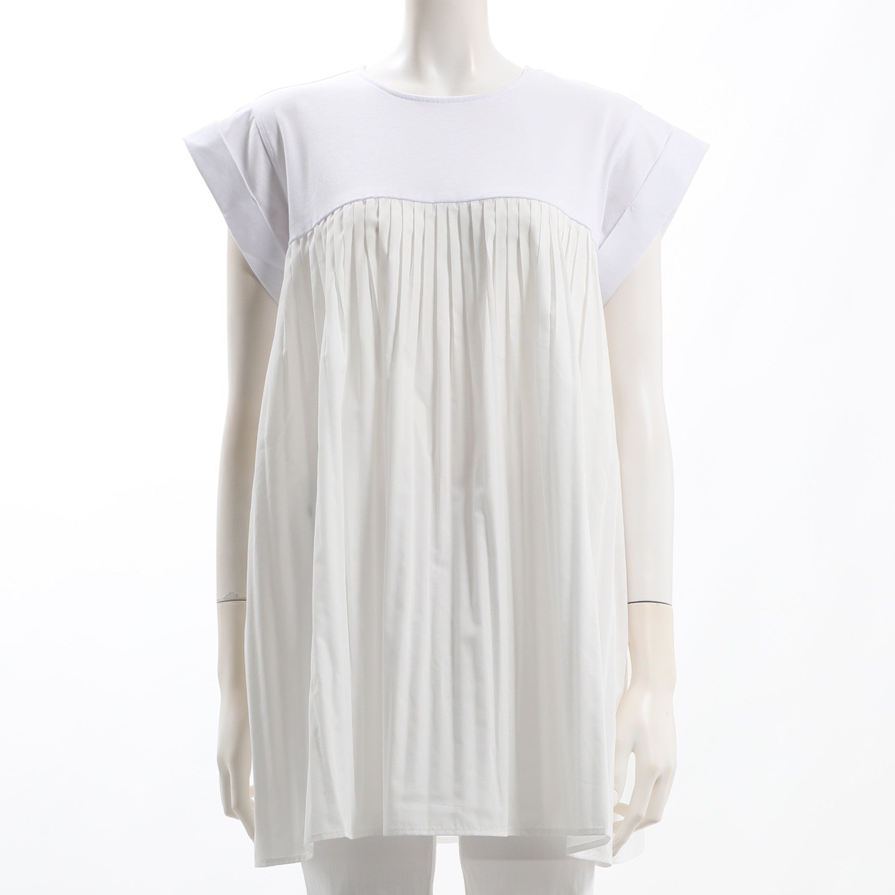 プリーツ切り替えがポイントのAラインカットソー。ボトムスにはデニムパンツを合わせてカジュアルに、テーパードパンツで辛さを加えてもいいですね。