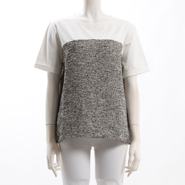 ツイード見えする質感の生地をTシャツにドッキングさせたトップスです。デニムパンツを合わせてカジュアルなスタイルに、ギャザースカートを合わせてレディライクなスタイルも素敵ですよ。