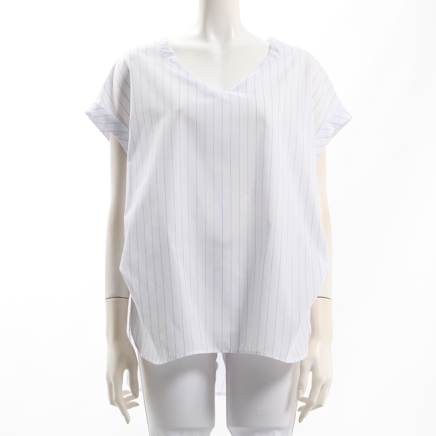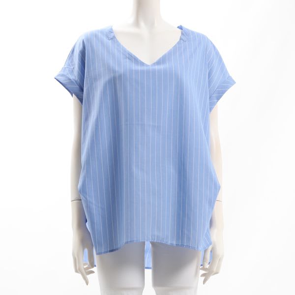 ストライプ柄のVネックシャツブラウスです。テーパードパンツとパンプスを合わせて綺麗めなスタイルに、ワイドパンツとスニーカーを合わせてカジュアルなスタイルもいいですね。