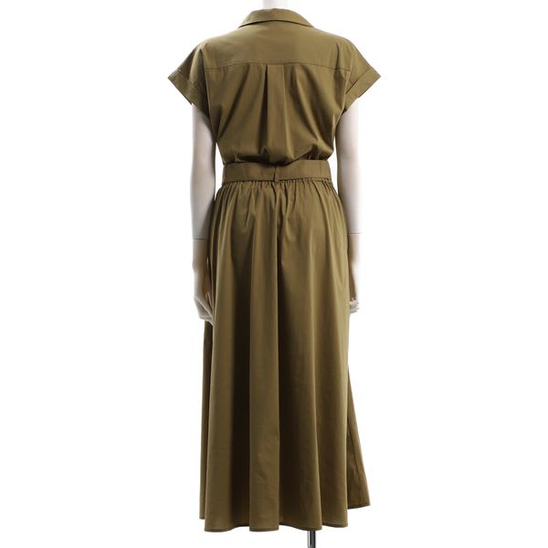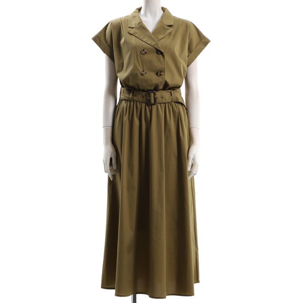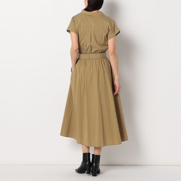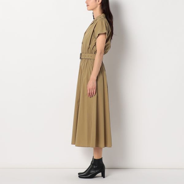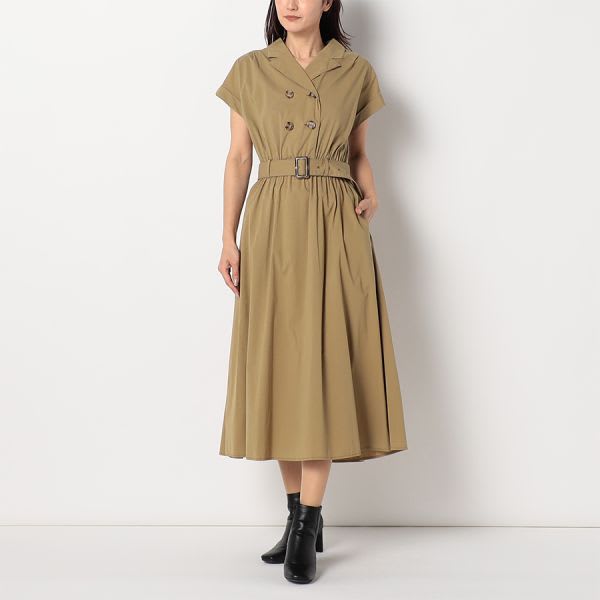 トレンチ風デザインのワンピースです。ハンドバッグとパンプスを合わせてキレイめなスタイルに、ワンハンドルバッグとミュールサンダルを合わせてモードなスタイルも素敵ですよ。