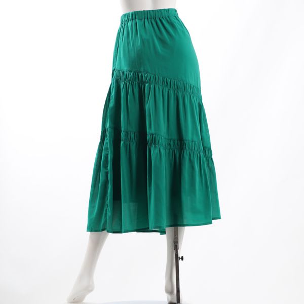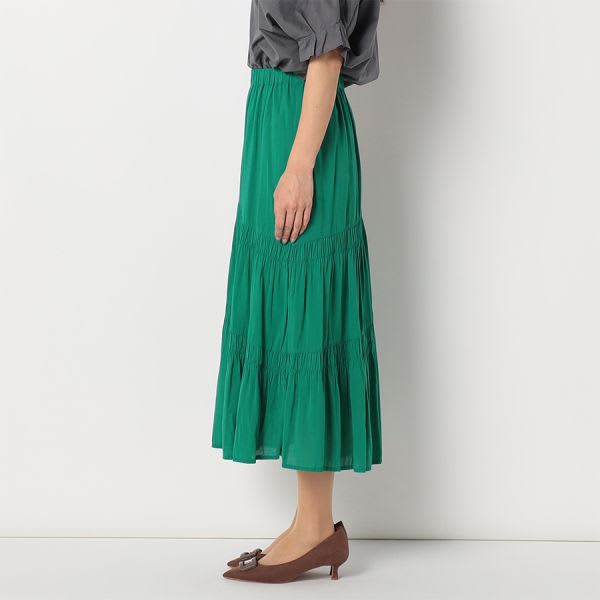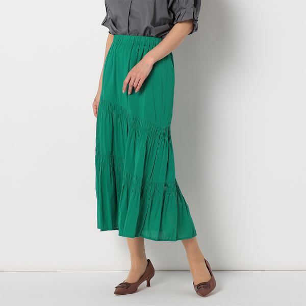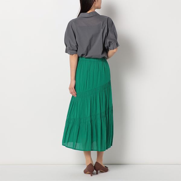 斜めに入ったティアードデザインがポイントのスカートです。リブカットソーを合わせてスッキリとしたスタイルに、オーバーサイズのTシャツを合わせてカジュアルにまとめたスタイルもおすすめですよ。