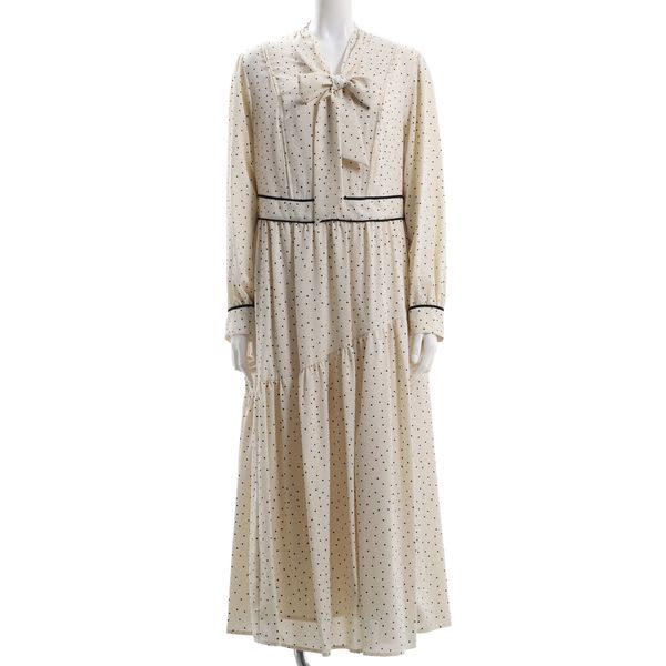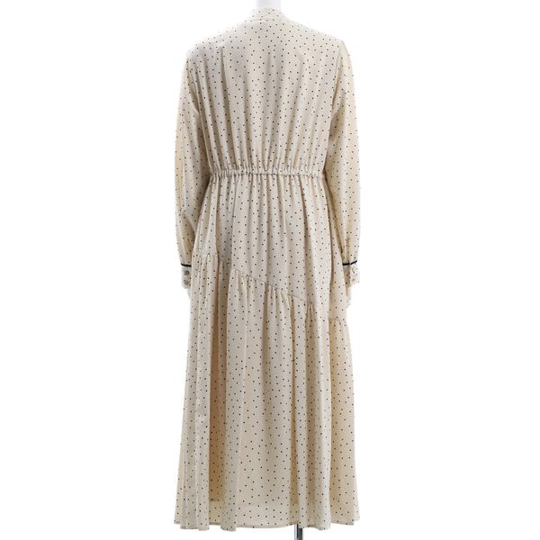 ドット柄のアシンメトリー2WAYワンピースです。首元のボウタイは、取り外し可能になっています。ラウンドトゥパンプスを合わせて、女性らしく。ボウタイを外してスニーカーを合わせ、カジュアルに着こなしてもステキですね。