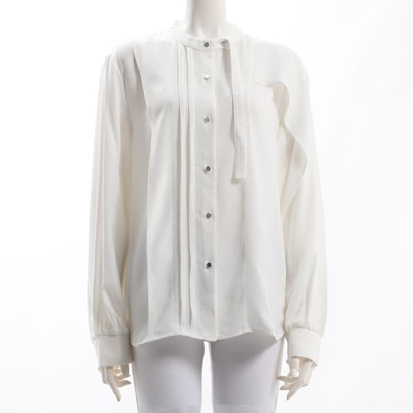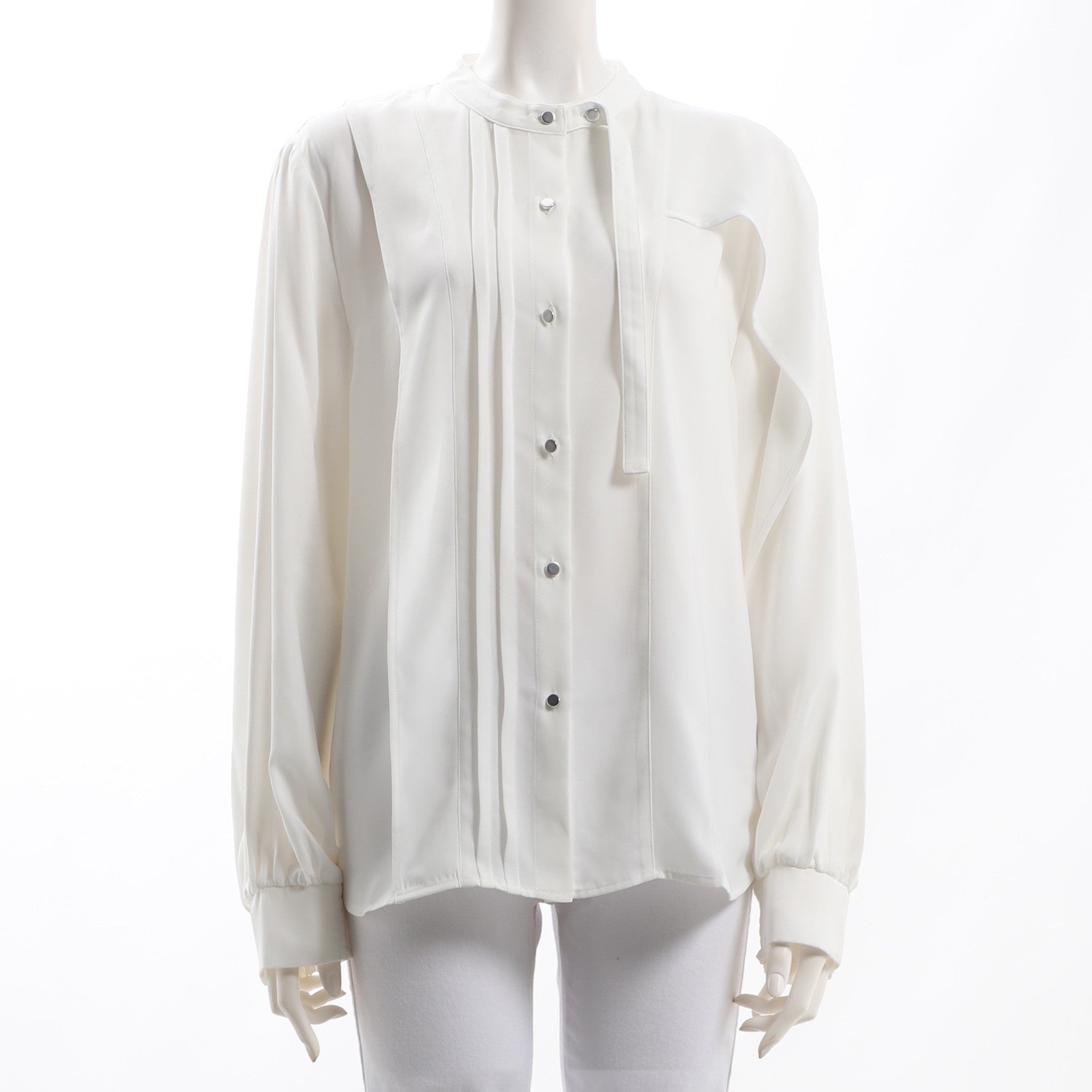 アシンメトリーなフロントデザインが特徴的なブラウスです。ワイドパンツとポインテッドトゥパンプスでスタイリッシュスタイルや、フレアスカートとラウンドトゥパンプスで上品なスタイルも素敵ですよ。
