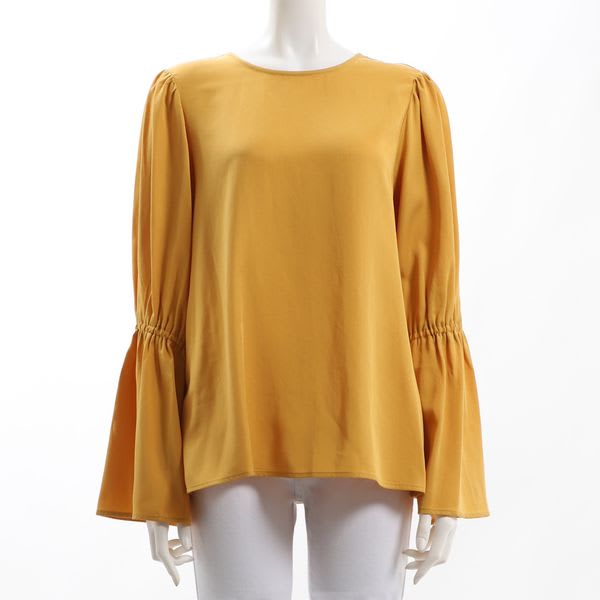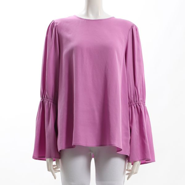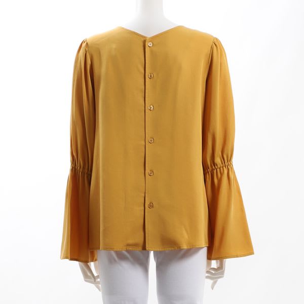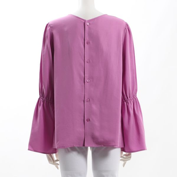 袖のフレアがポイントの大人フェミニンな印象のブラウス。程よい肉感と再生繊維(セルロース)の滑らかで肌触り良く、落ち感があるキレイ目な素材を使用。後ろ身頃は釦明きで首元をすっきり、肩回りも華奢見えします、どんなパンツにも合わせやすく、ベストを合わせると袖フレアデザインが気映えるコーディネートに。