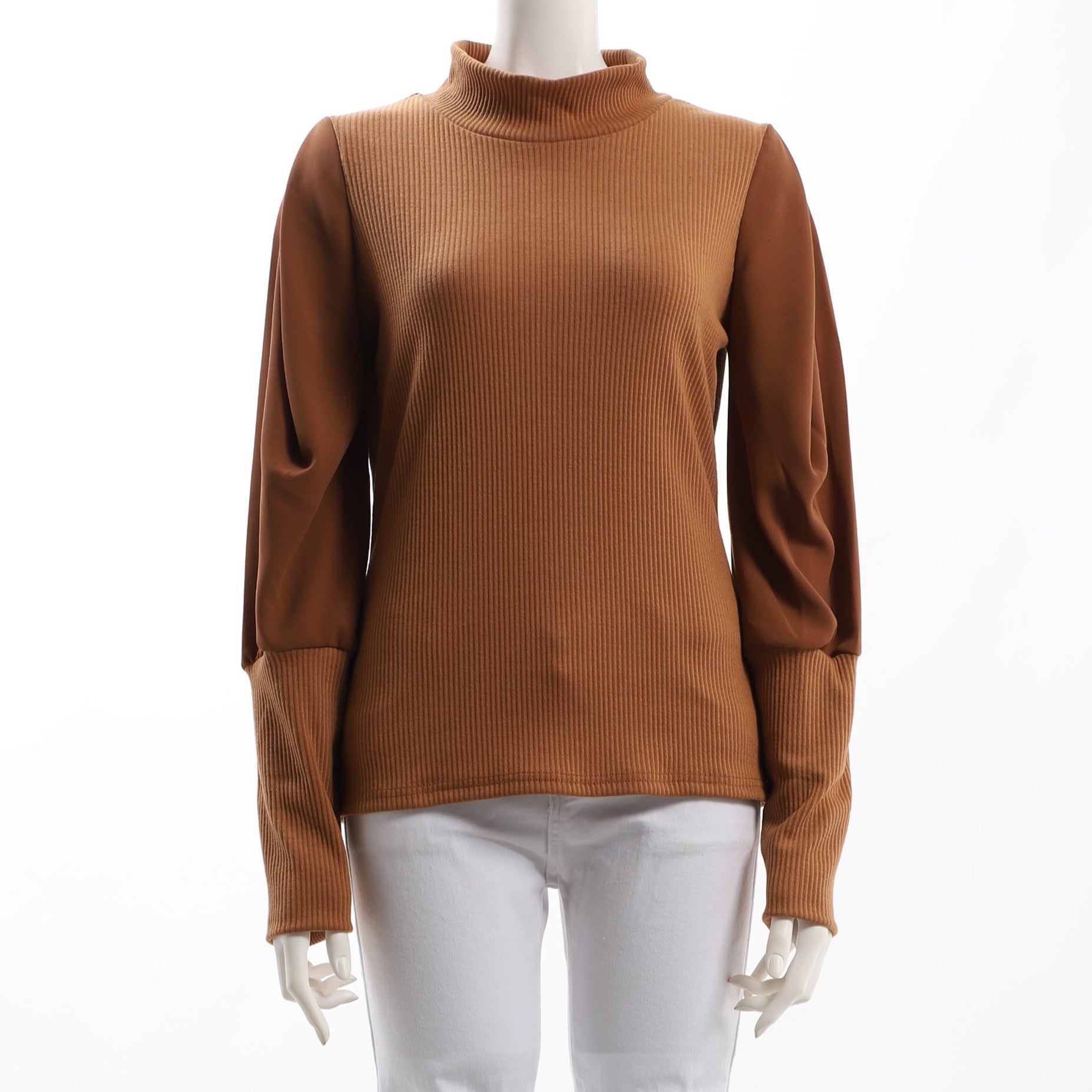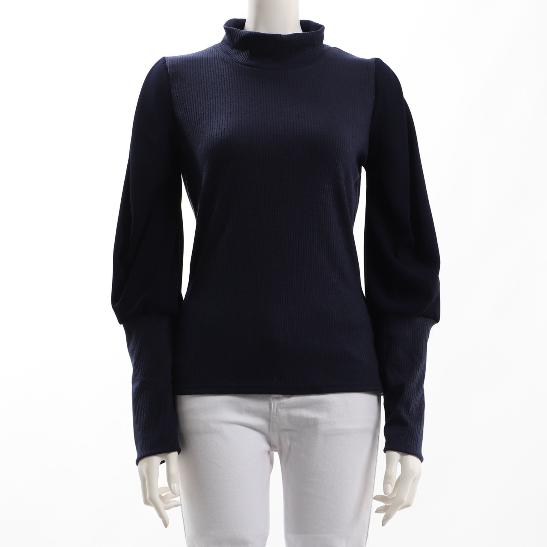 異素材切り替えのボトルネックリブニットです。フレアスカートとパンプスを合わせてきれいめに、デニムパンツとスニーカーを合わせてカジュアルに仕上げても良いですね。