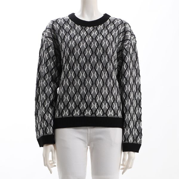 編み柄がポイントのニット。ボトムスにはプリーツスカートを合わせて女性らしく、テーパードパンツで辛さを加えてもいいですね。