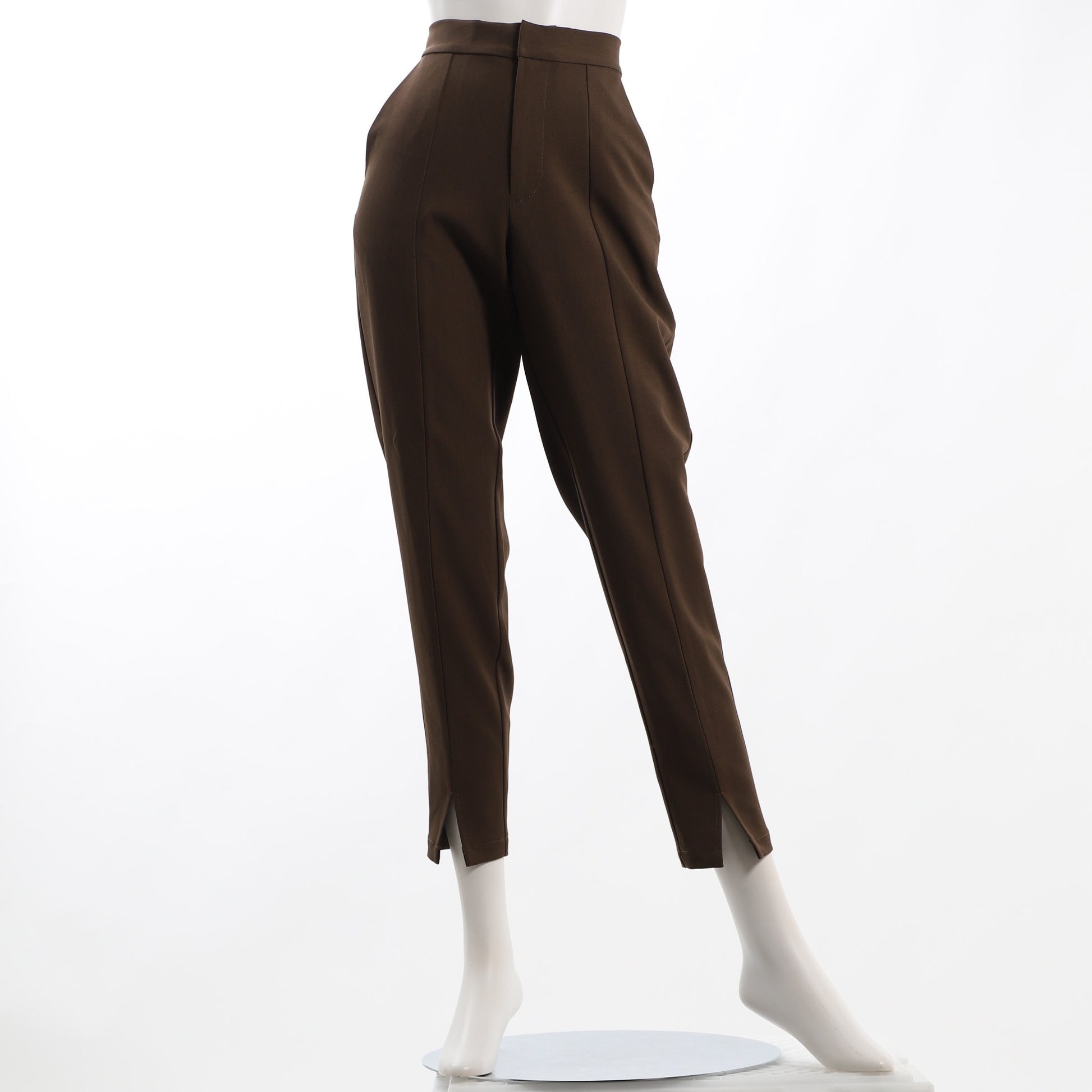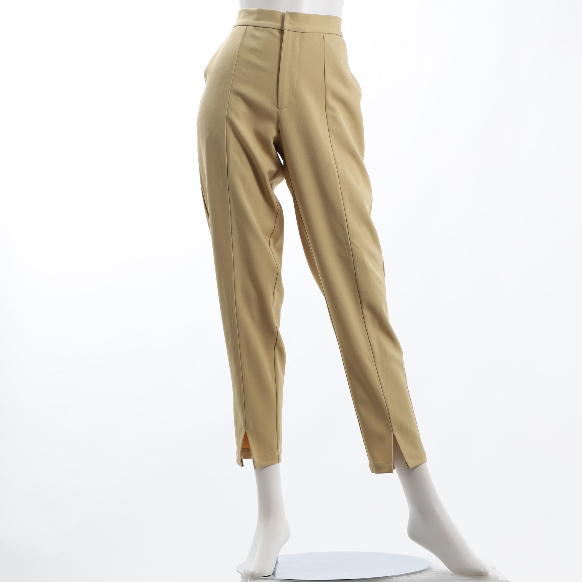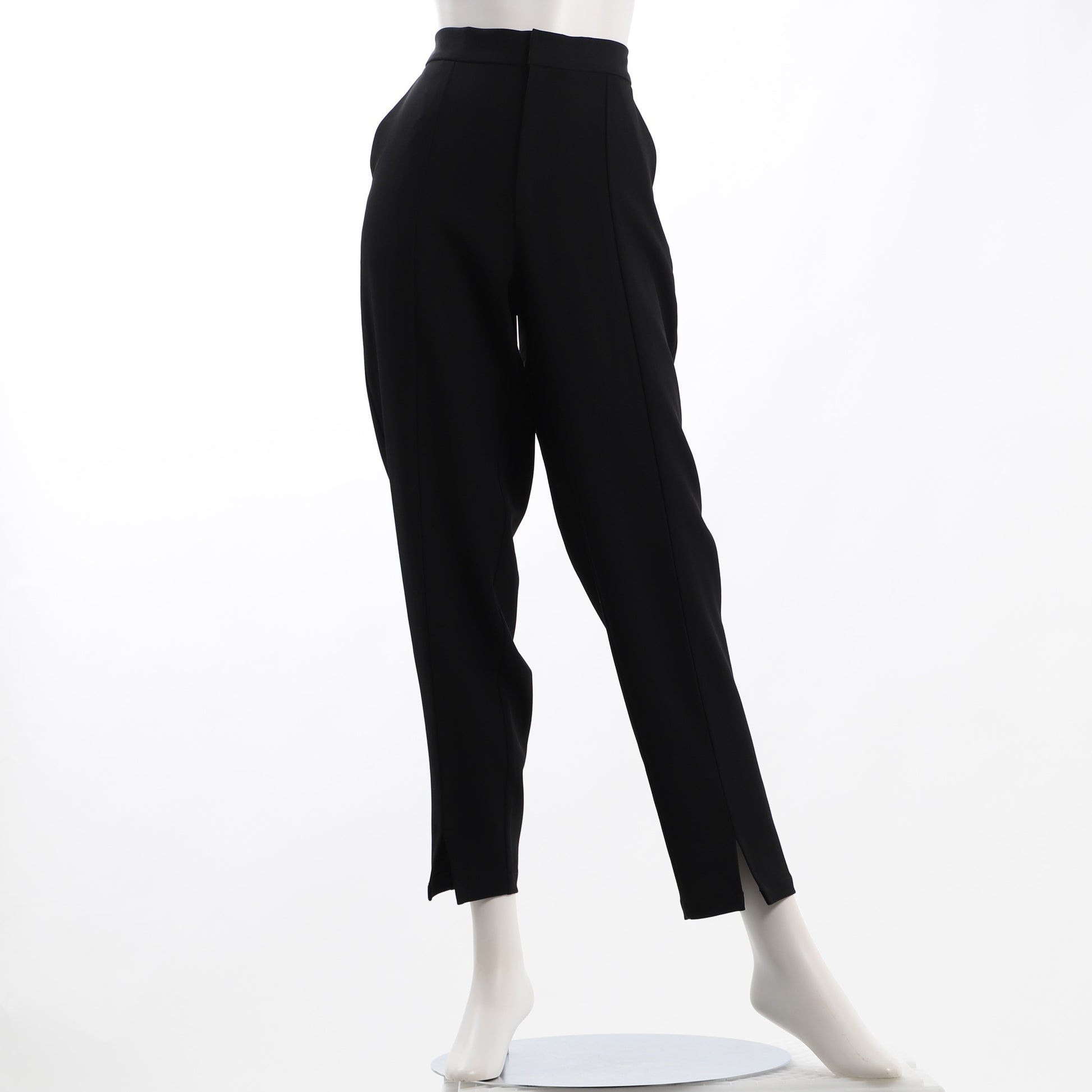 センターシームとフロントスリットがポイントのテーパードパンツ。スタンドカラーブラウスを合わせてきれいめな着こなしに、ベーシックなカットソーを合わせてカジュアルに着てもいいですね。