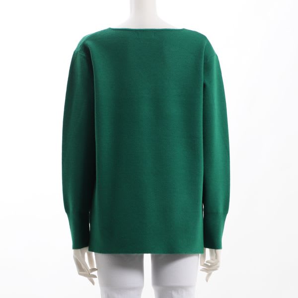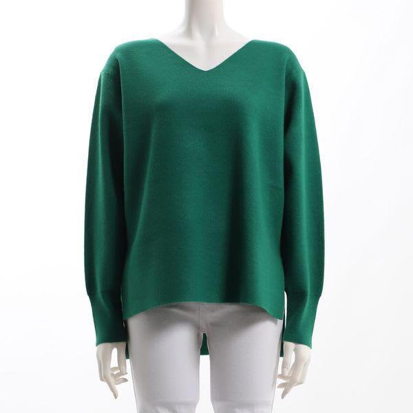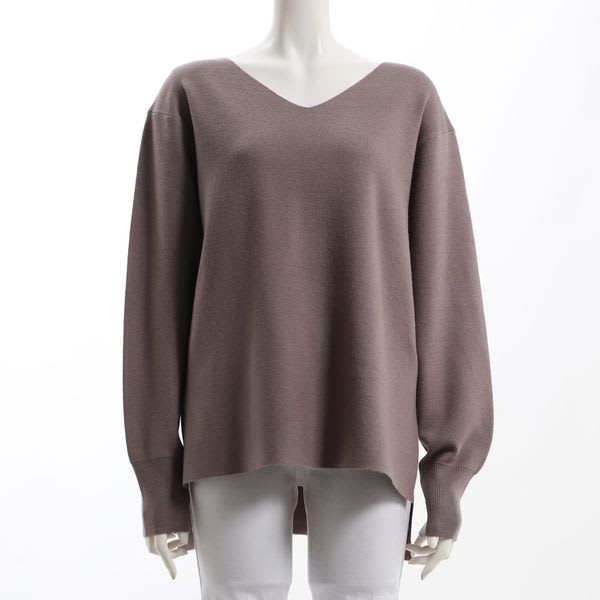バックテールデザインのVネックニットです。デニムパンツにスニーカーを合わせて、カジュアルに。プリーツスカートにショートブーツを合わせて、女性らしく着こなしてもステキですね。
