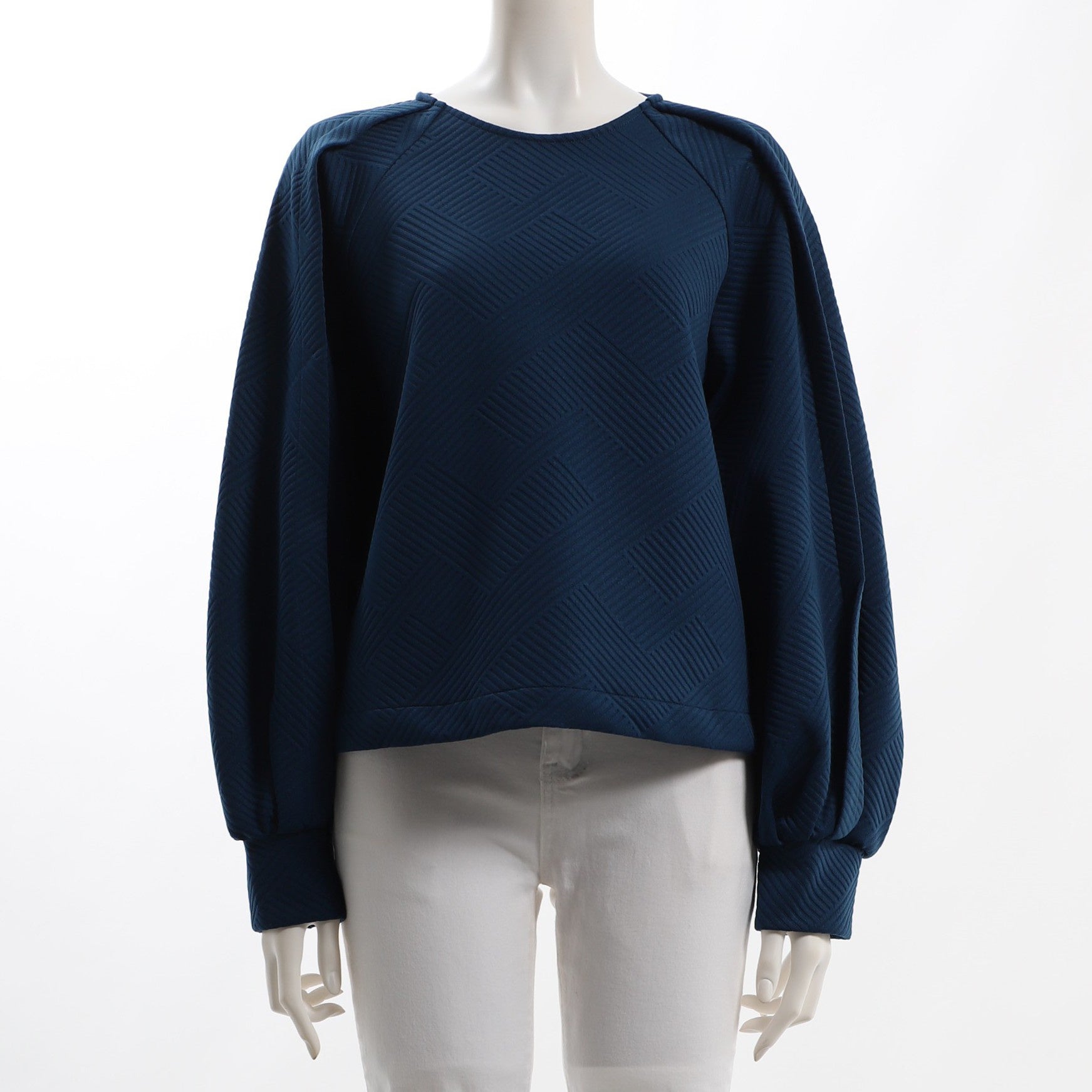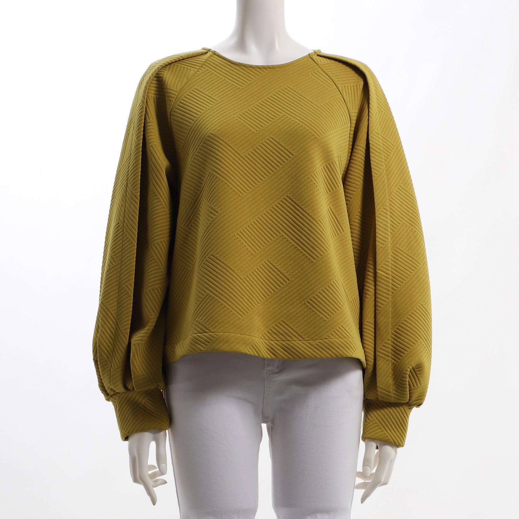 シェブロン風の編み柄や袖のタックなどがポイントのカットソー。スキニーパンツを合わせてかっこよく着たり、プリーツスカートを合わせてレディライクに着てもいいですね。