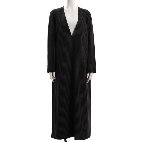 スーツのようなストライプ柄素材を使用し、たっぷりとしたシルエットでモードに仕上げたワンピース。深いVネックはシャープな大人カジュアルスタイルにピッタリのデザイン。ストライプ柄と長めのレングスでスッキリした縦長シルエットでスタイルアップ効果も期待できます。インナーにタンクトップ、タートルニットを合わせたりと、インナーを変えて楽しんでいただけます。