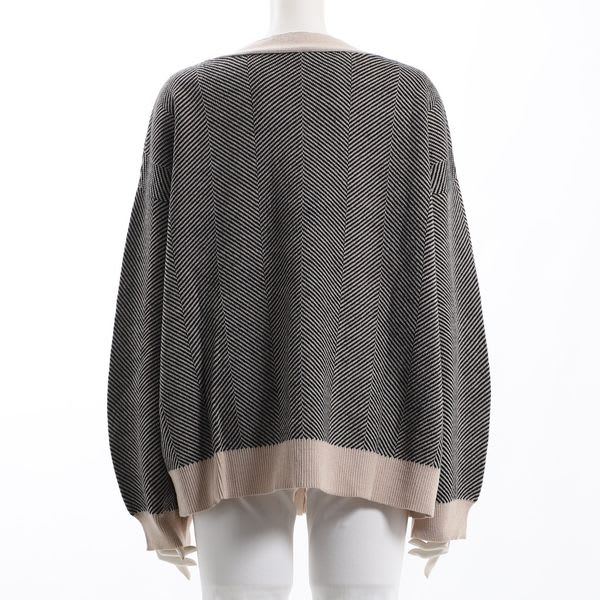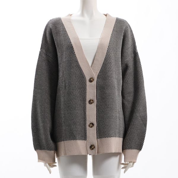 ヘリンボーン柄のVネックカーディガンです。ボウタイブラウスにマーメイドスカートを合わせて、女性らしく。カットソーにデニムパンツを合わせて、カジュアルに着こなしてもステキですね。
