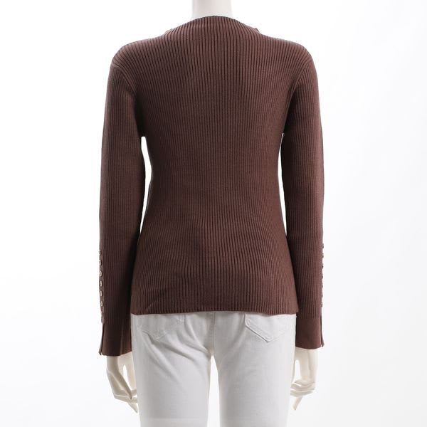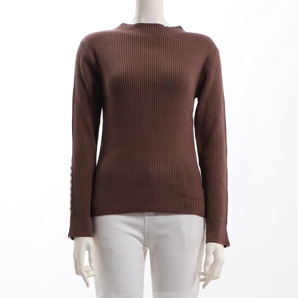 お袖のボタンデザインがポイントのリブニットです。デニムパンツにスニーカーを合わせて、カジュアルに。フレアスカートにラウンドトゥパンプスを合わせて、女性らしく着こなしてもステキですね。