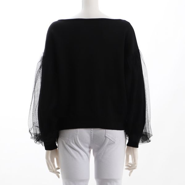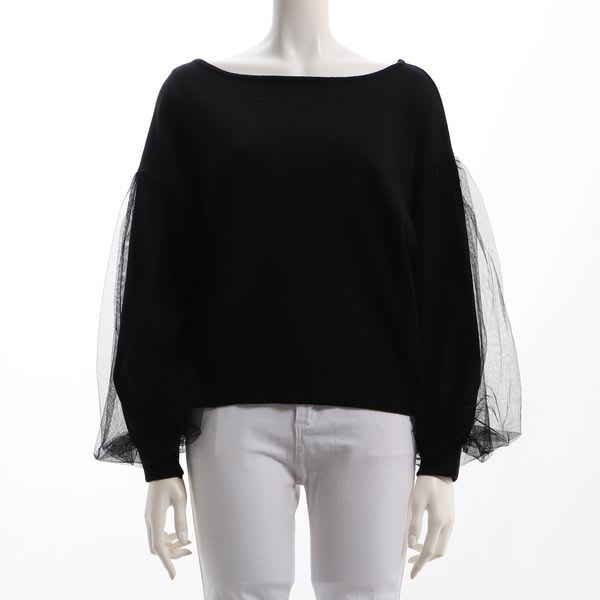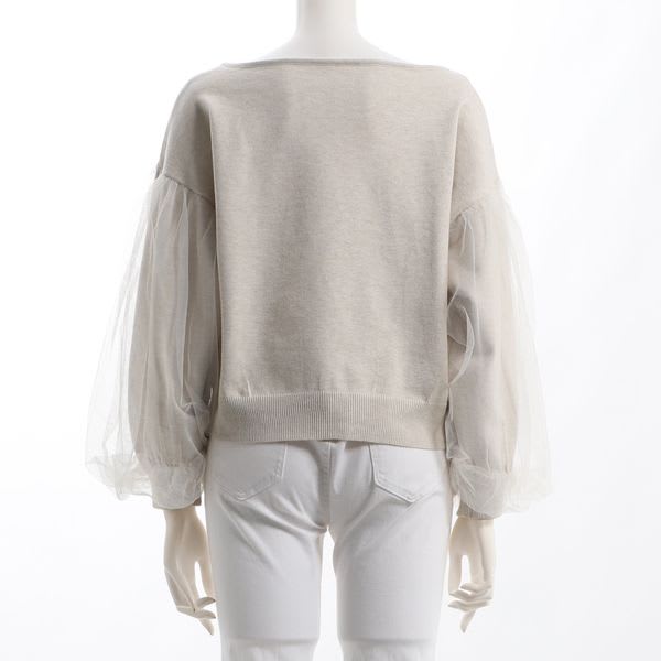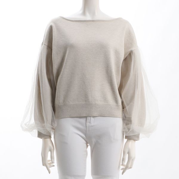チュールスリーブニットです。デニムパンツにスニーカーを合わせて、カジュアルに。フレアスカートにラウンドトゥショートブーツを合わせて、女性らしく着こなしてもステキですね。