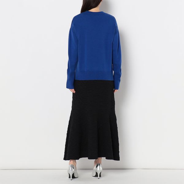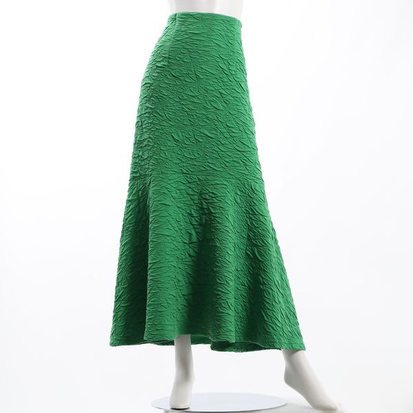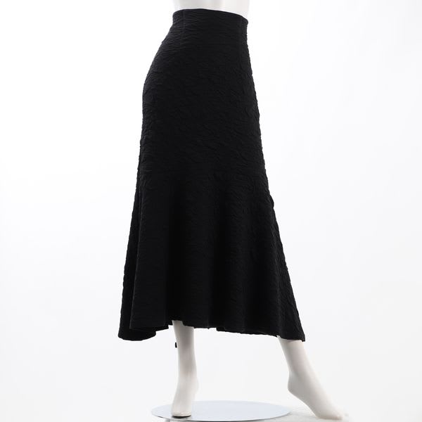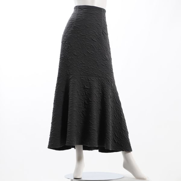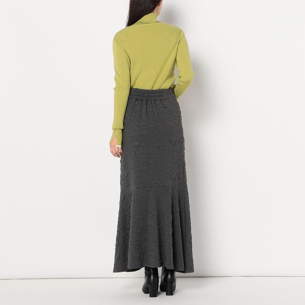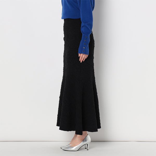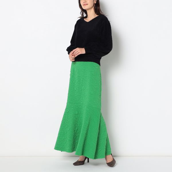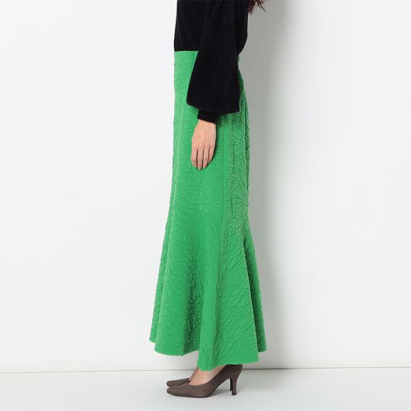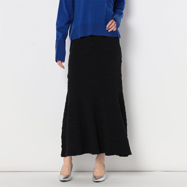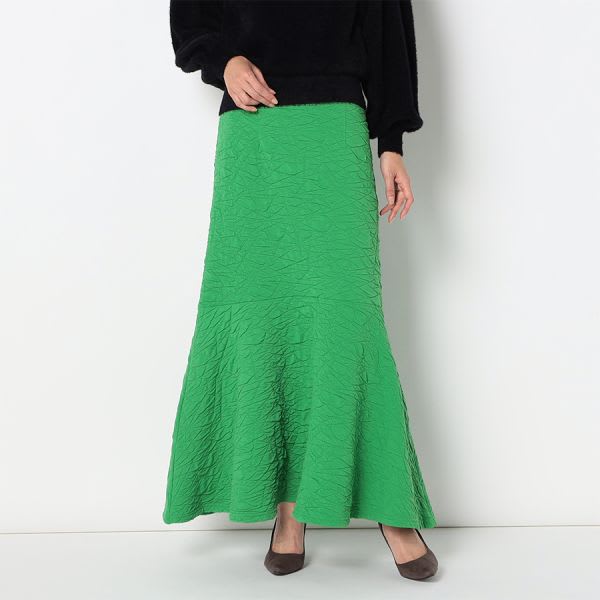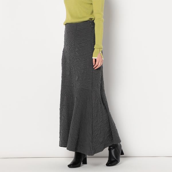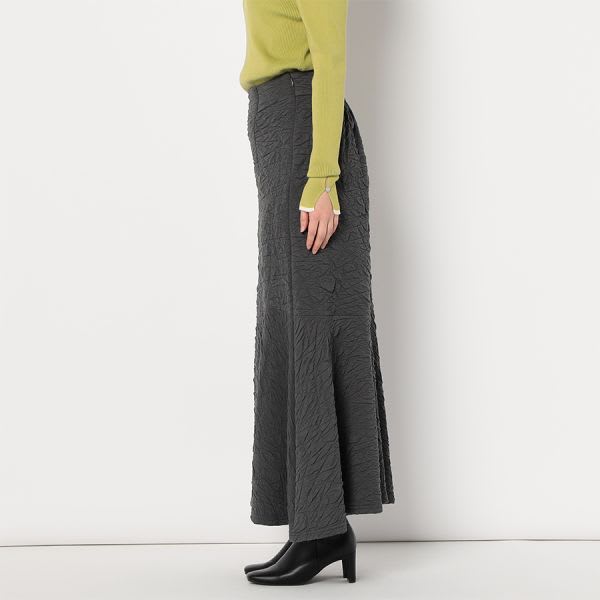 凸凹とした生地が特徴的なマーメイドスカートです。ボウタイブラウスとラウンドパンプスを合わせて女性らしいスタイルに、リブカットソーとスニーカーを合わせてカジュアルスタイルもいいですね。