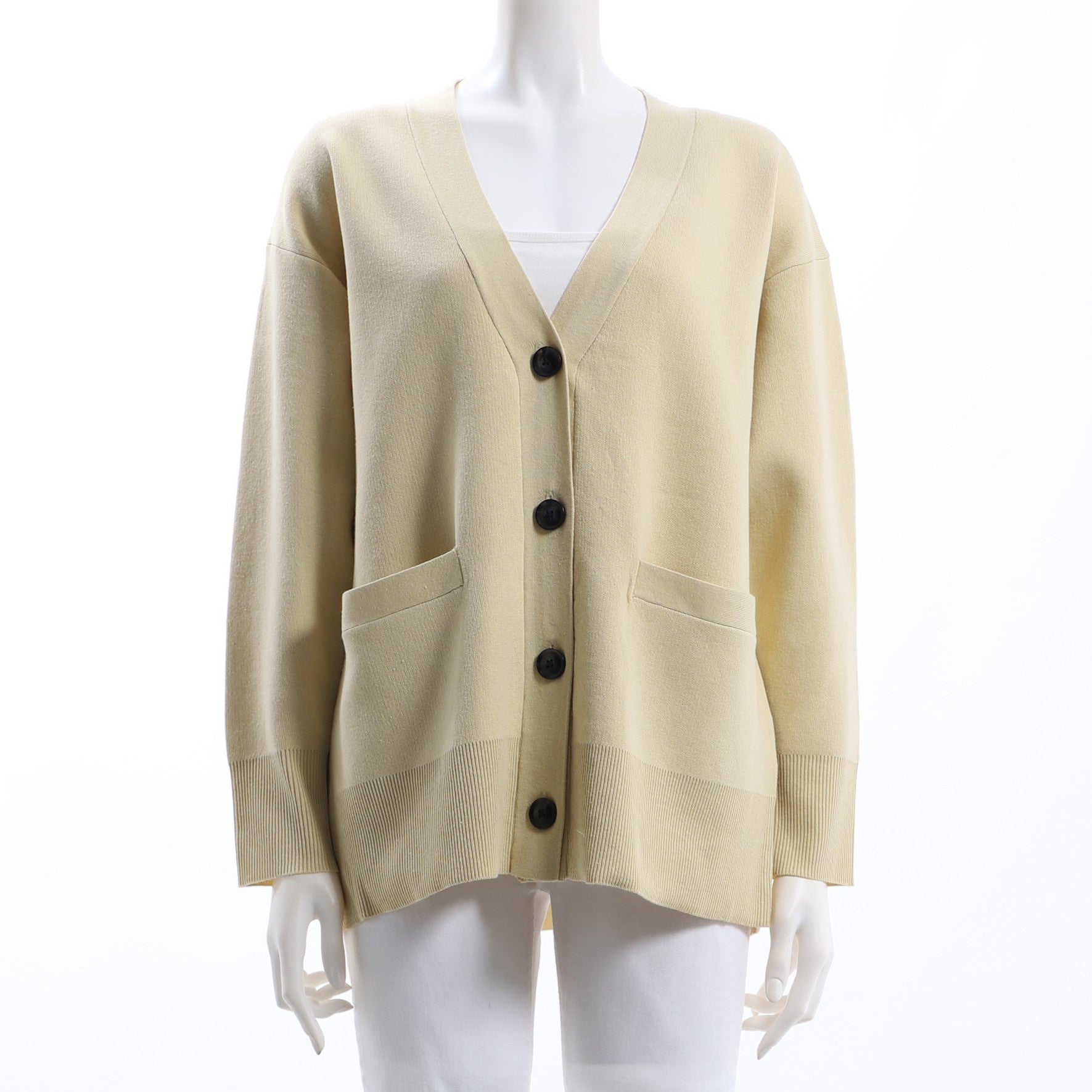 アウトポケットがポイントのカーディガンです。シンプルなデザインなので、着回していただきやすいですよ。カットソーとデニムを合わせたコーデにはもちろん、ワンピースに羽織るのも良いですね。