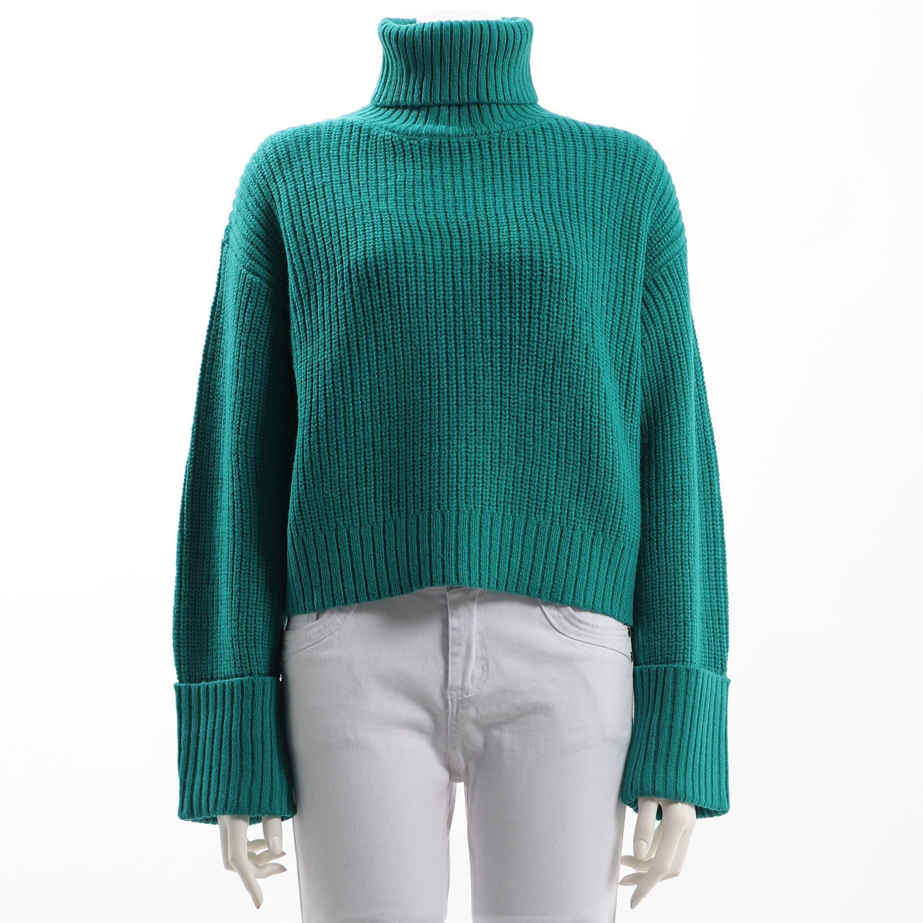 お袖の折り返しデザインがポイントのタートルネックニットです。デニムパンツにスニーカーを合わせて、カジュアルに。マーメイドスカートにバレエシューズを合わせて、女性らしく着こなしてもステキですね。