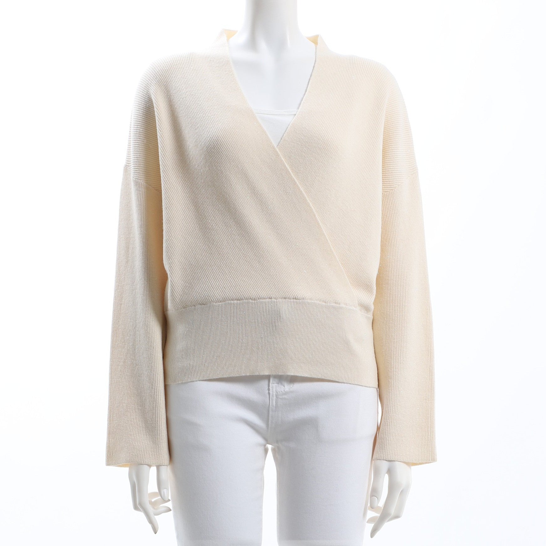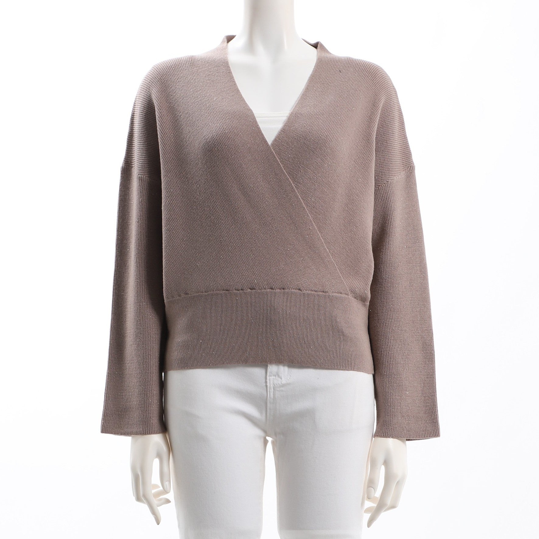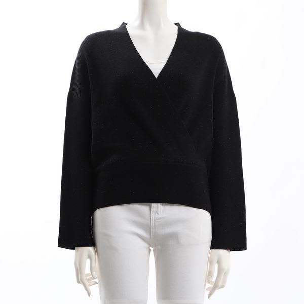 ラメ混のカシュクールニット。インナーには白や同系色のキャミソールやタンクトップなどを着ていただくと安心ですよ。マーメイドスカートを合わせてエレガントに、テーパードパンツを合わせてかっこよく着てもいいですね。