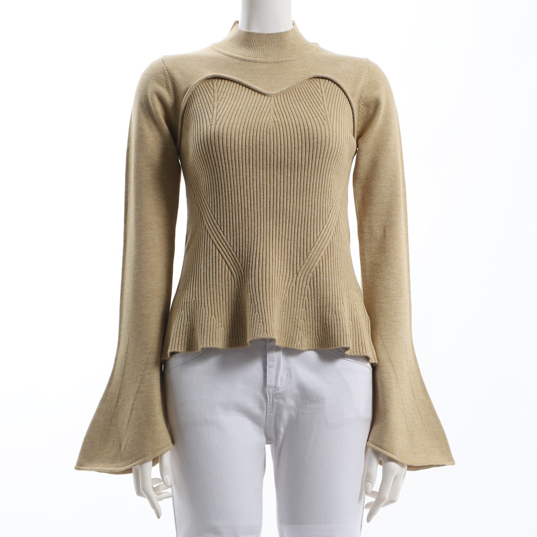 ビスチェ風デザインのフレアスリーブニットです。マーメイドスカートにラウンドトゥパンプスを合わせて、女性らしく。デニムパンツにスニーカーを合わせて、カジュアルに着こなしてもステキですね。