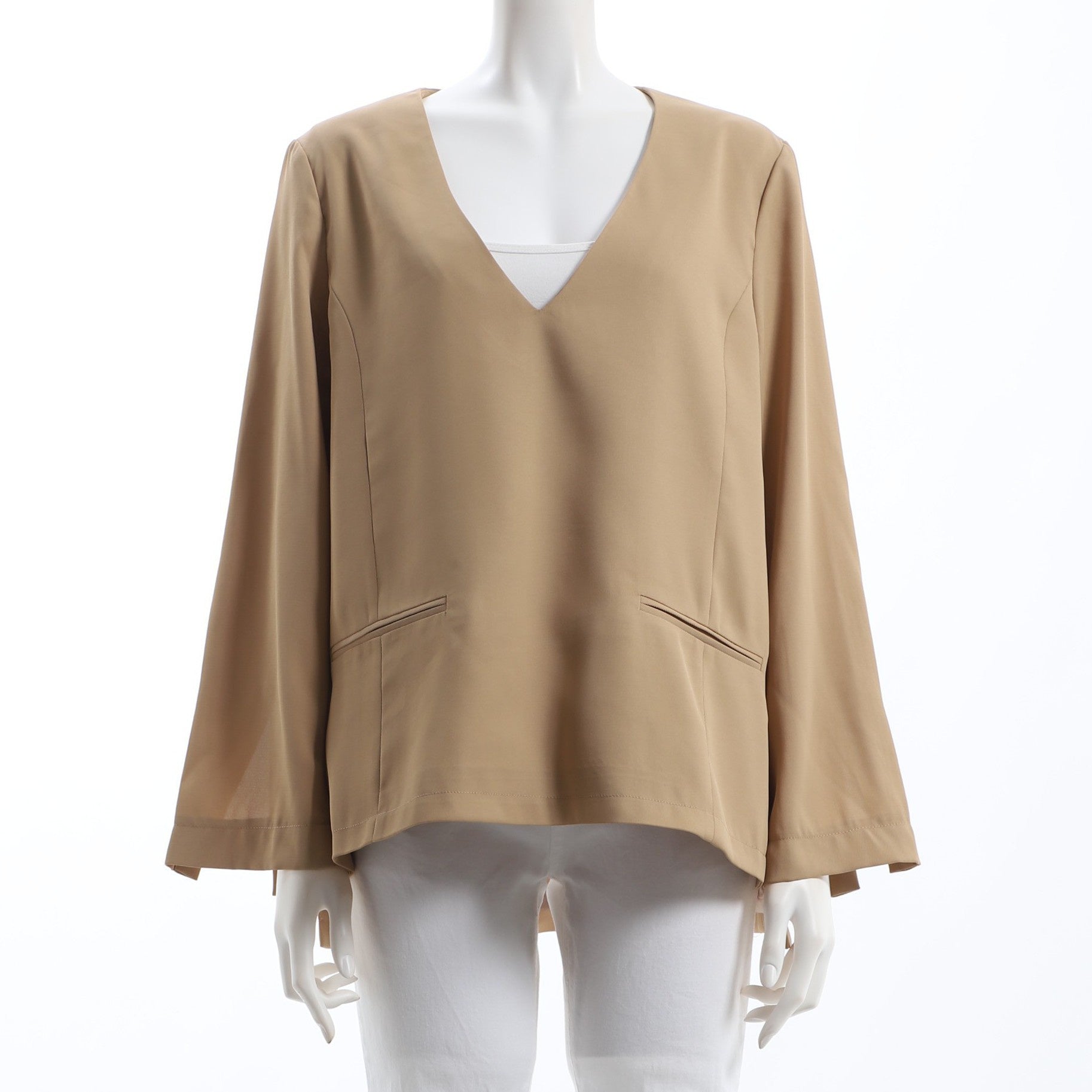 ポケットデザインがポイントのVネックブラウス。インナーにシャツ、ボトムスにテーパードパンツを合わせてスマートに。ハイネックカットソーとデニムパンツでカジュアルにまとめてもいいですね。