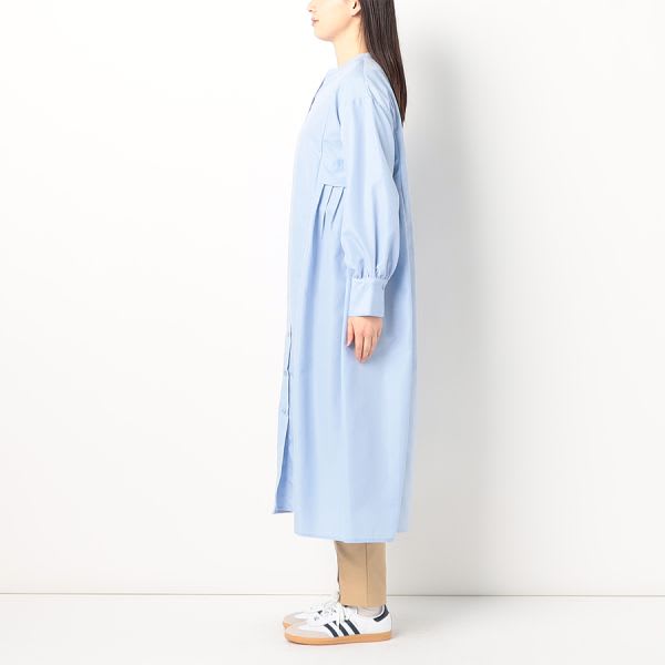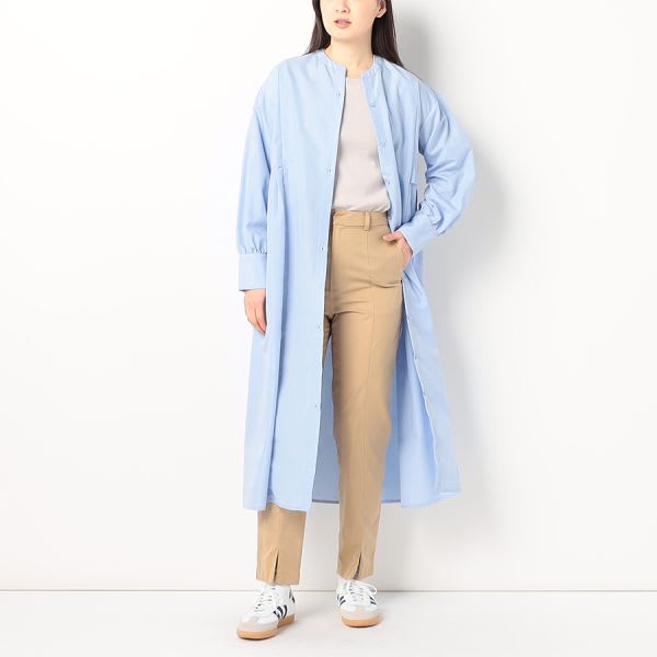 肩にかかるサイドデザインがアクセントになったシャツワンピース。小物には、ロングパールネックレスとパンプスを合わせてキレイめに、大ぶりのオーバルイヤリングとキャンバススニーカーでラフにまとめてもいいですね。