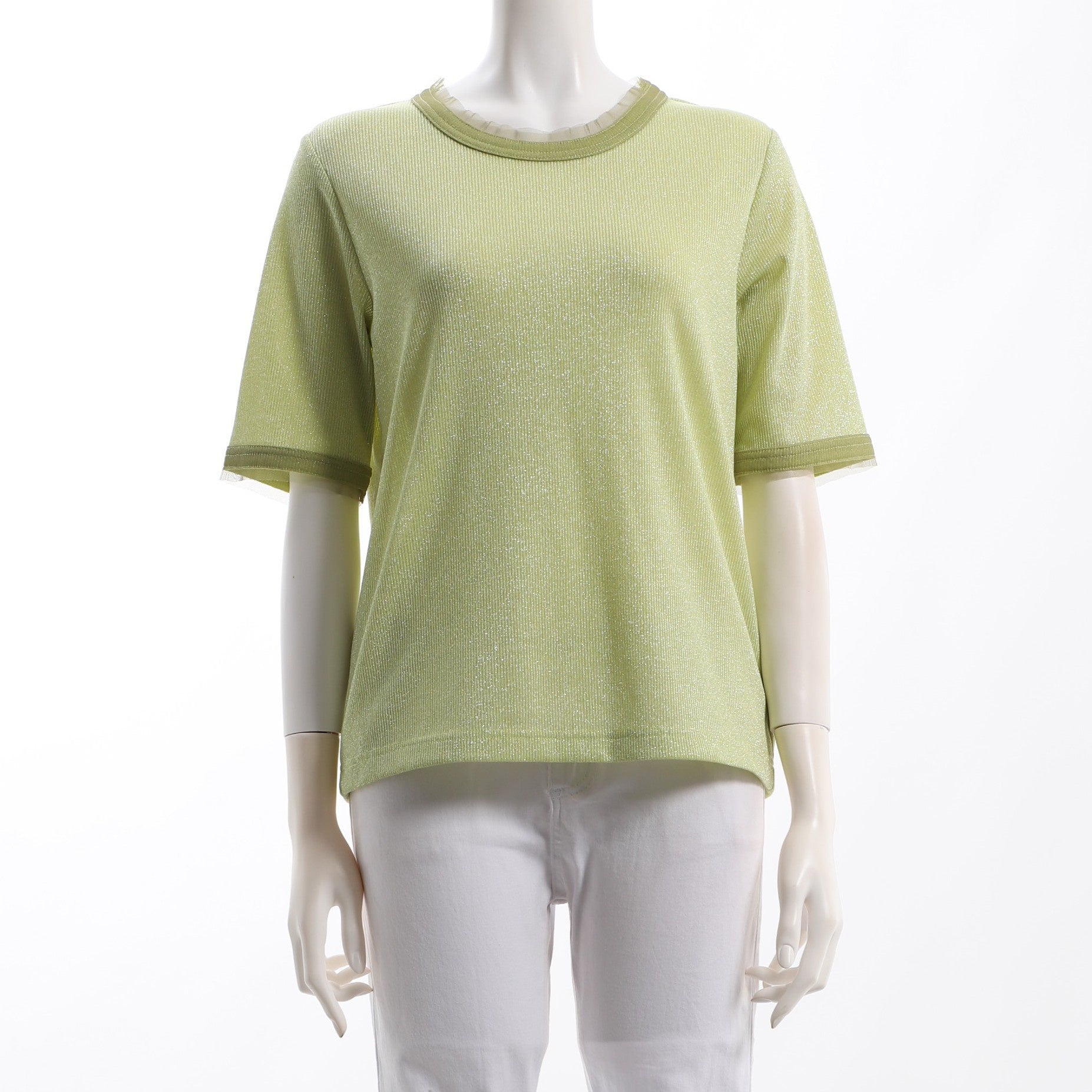 袖口、襟部分のチュールが目を惹くラメリブカットソーです。デニムパンツにスニーカーを合わせて、カジュアルな着こなしに。フレアスカートにバレエシューズを合わせて、女性らしく着こなしてもステキですね。