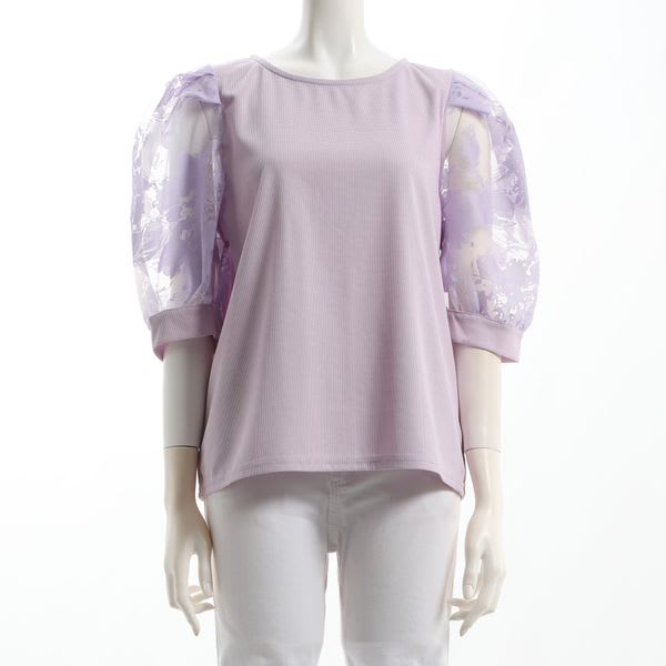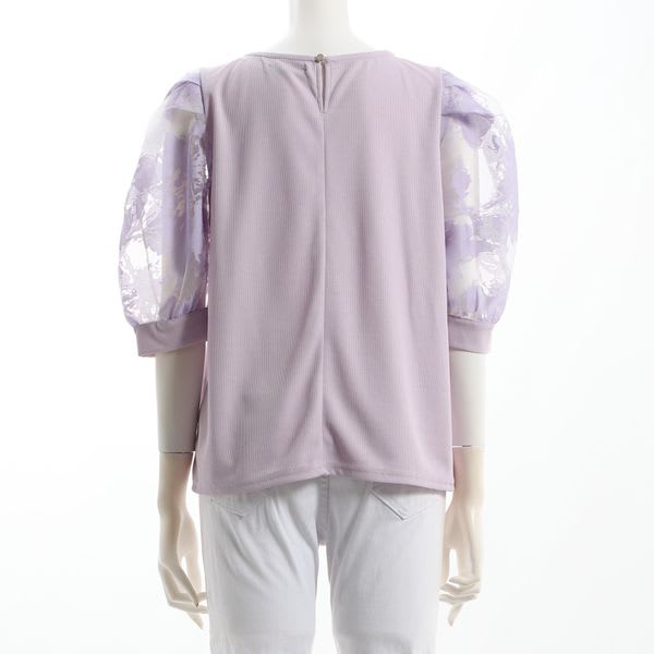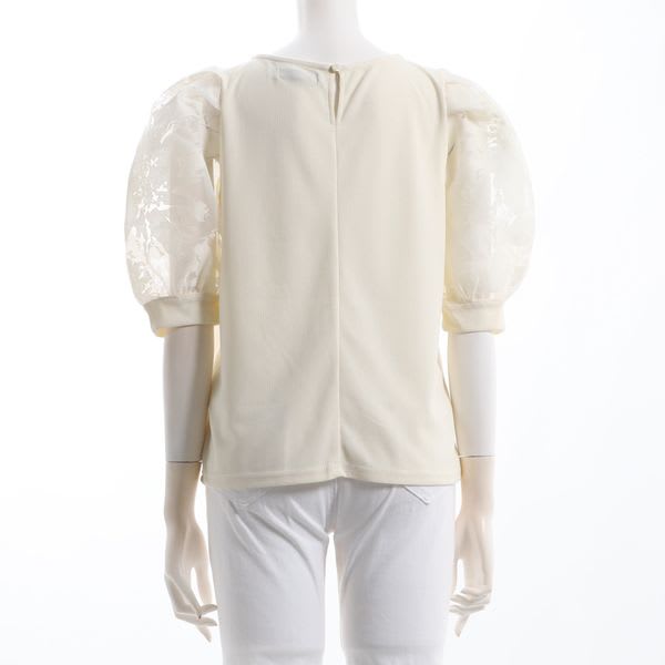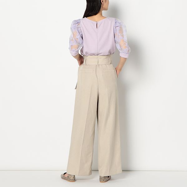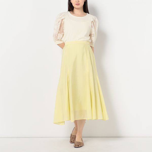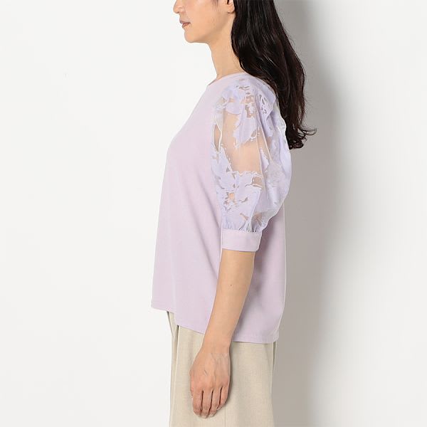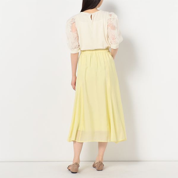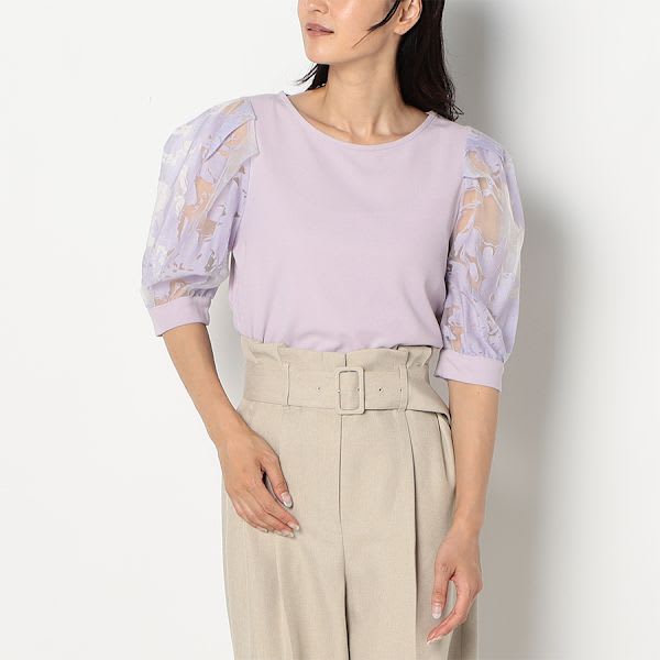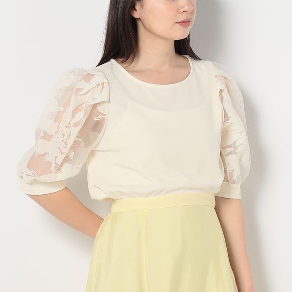シアーなパフスリーブが繊細なフェミニン感をプラスするデザインブラウス。ヒールパンプスとタックフレアスカート、小ぶりなハンドバッグでドラマチックなお出かけスタイルに。ダークカラーのラップ風ワイドパンツとポインテッドパンプスでモードに仕上げても素敵ですよ。