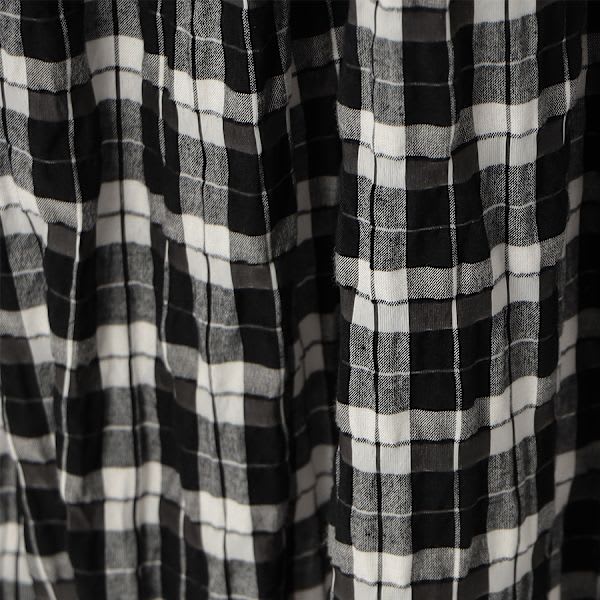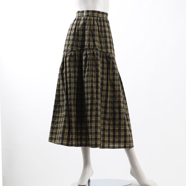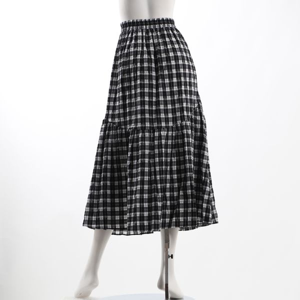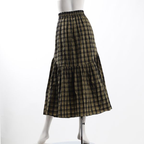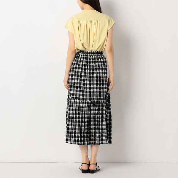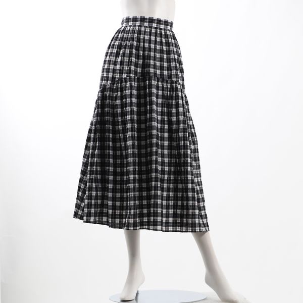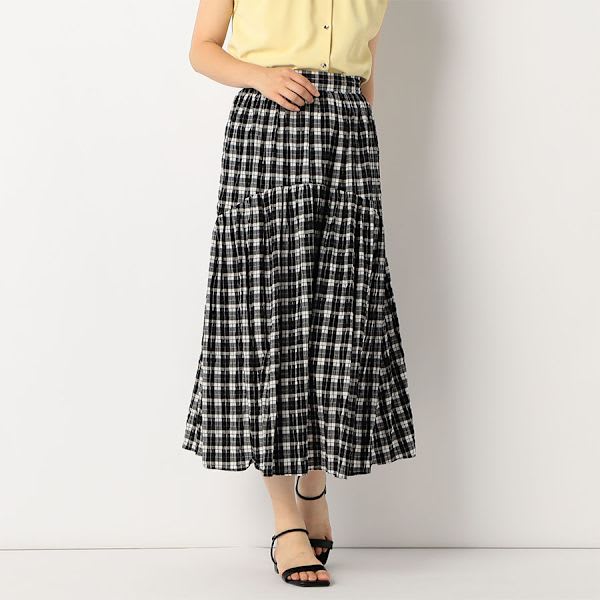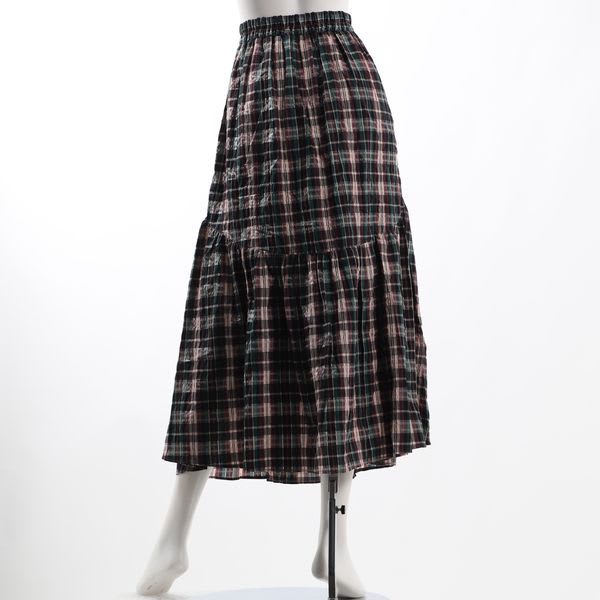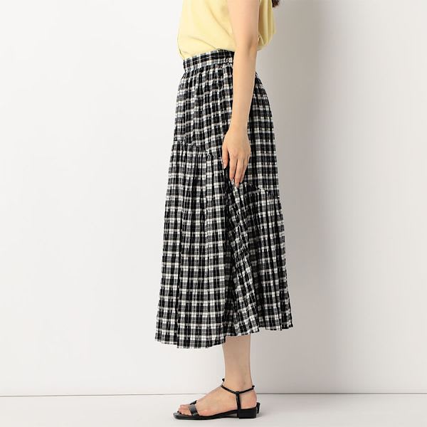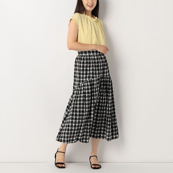 コーディネートの主役になるタータンチェック柄フレアスカート。ややハリ感と程よく光沢感のある素材で、ポコポコとした表情の生地を使用しています。