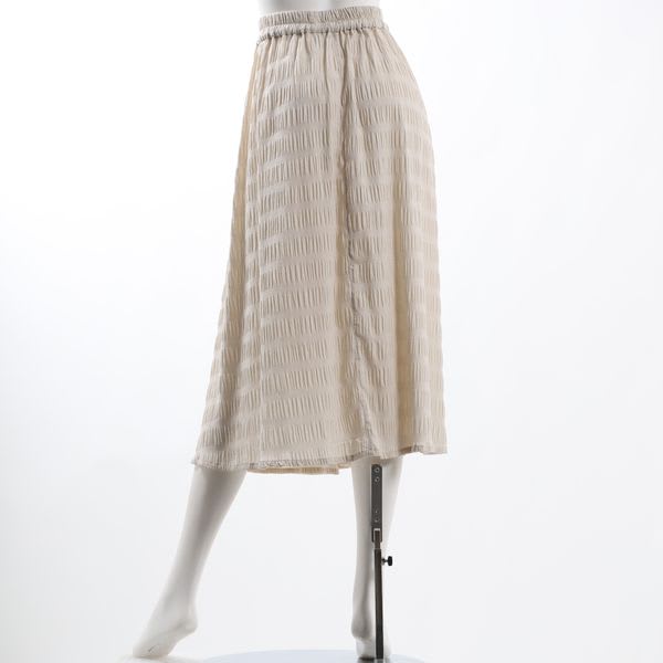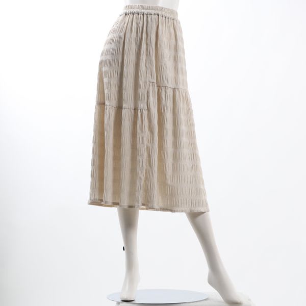 切り替えデザインや凹凸感のある素材がポイントのティアードスカートです。同色系のペチコートを合わせておめしくださいね。カットソーとスニーカーを合わせてカジュアルなスタイルに、シャツとローファーを合わせてクラシカルなスタイルにまとめていただくのもオススメです。