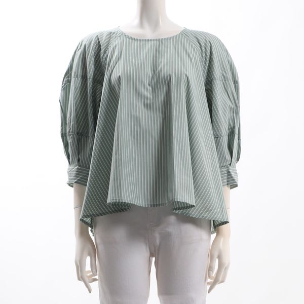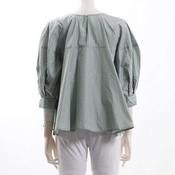 ボリュームスリーブがポイントのストライプ柄ブラウスです。テーパードパンツとラウンドトゥパンプスを合わせてレディライクなスタイルに、デニムパンツとスニーカーを合わせてカジュアルなスタイルに仕上げていただくのも素敵ですよ。