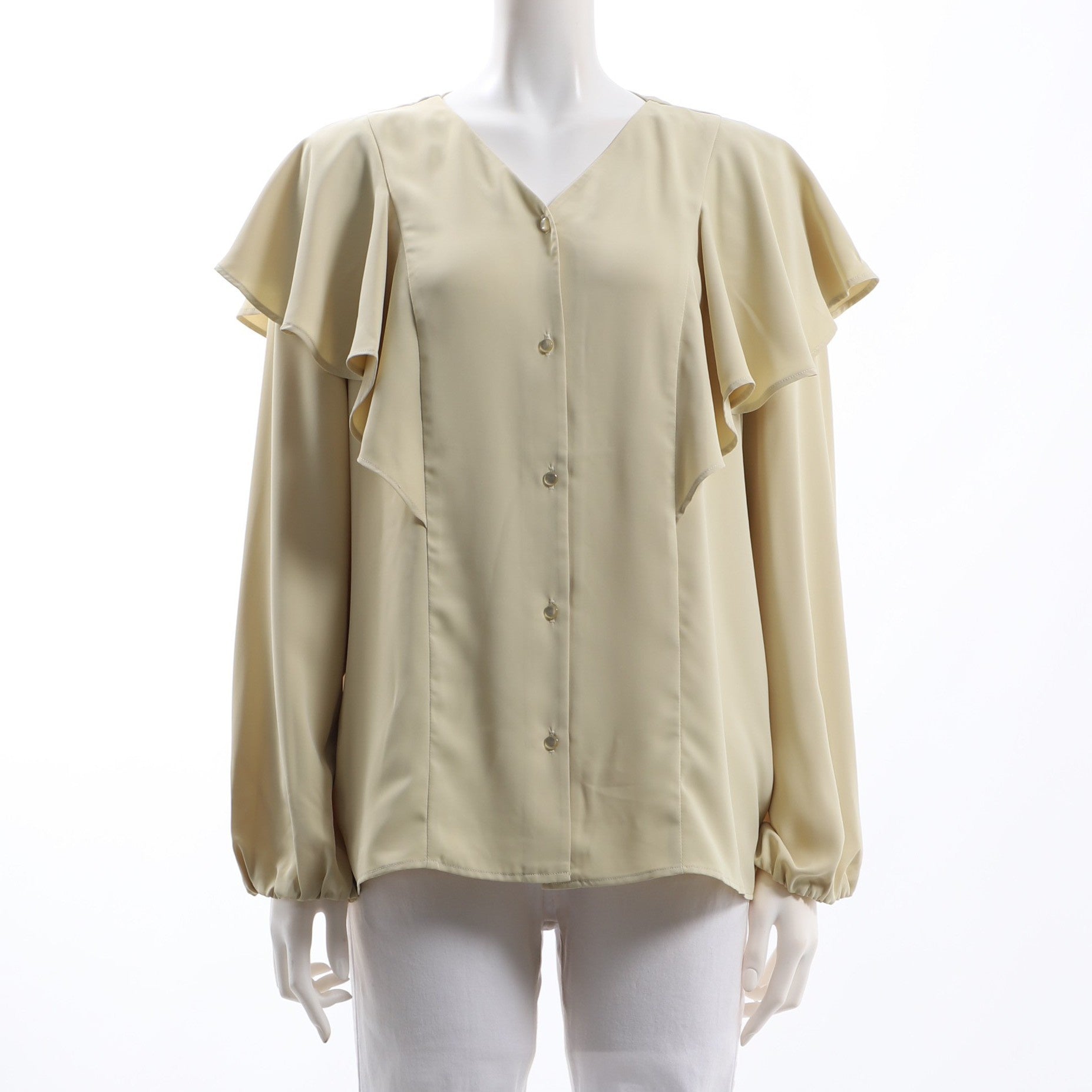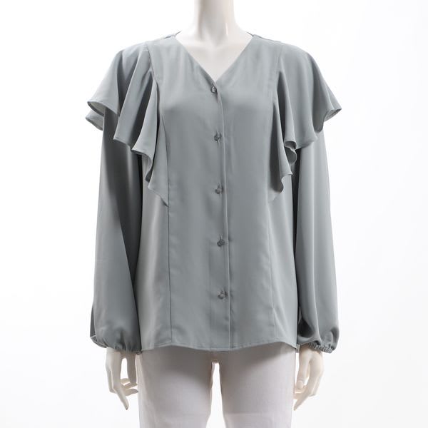 フリルデザインがポイントのVネックブラウスです。マーメイドスカートとラウンドトゥパンプスを合わせてレディライクなスタイルに、デニムパンツとスニーカーを合わせてカジュアルなスタイルに仕上げていただくのも素敵ですよ。