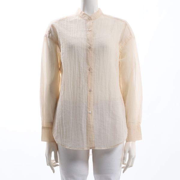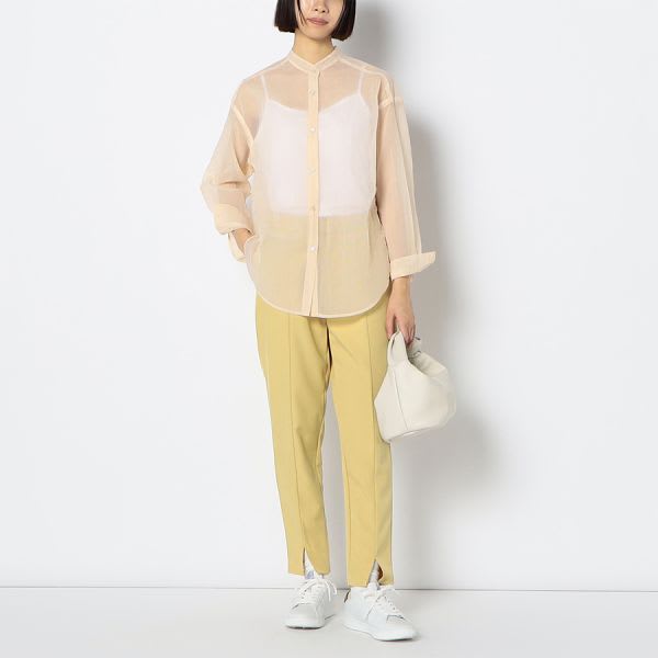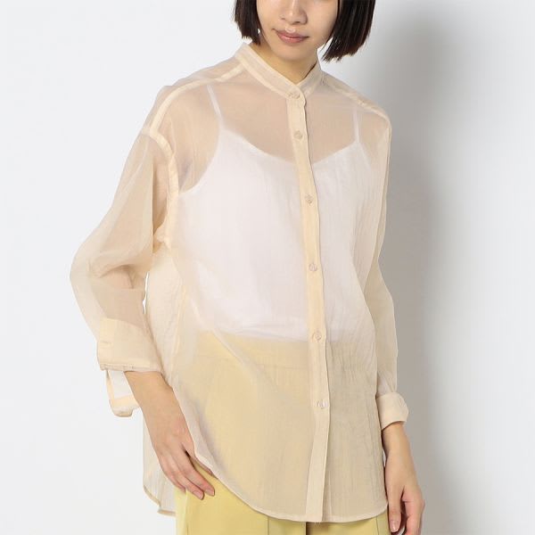 シアー素材のスタンドカラーシャツ。レイヤードを楽しんでいただけるトレンド感のあるアイテム。インナーにはキャミソールを合わせて抜け感を出したり、ロングジレを上に羽織っても◎。ワンピースの上に羽織としてコーディネートするのも素敵です。