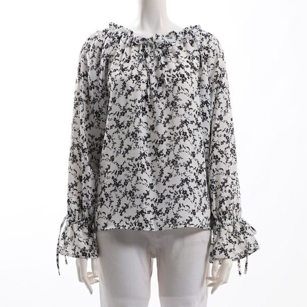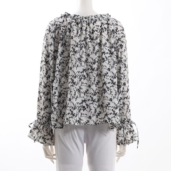 胸元やお袖のリボンが目を惹く花柄ブラウスです。マーメイドスカートにラウンドトゥパンプスを合わせて、女性らしく。デニムパンツにバレエシューズを合わせて、カジュアルに着こなしてもステキですよ。